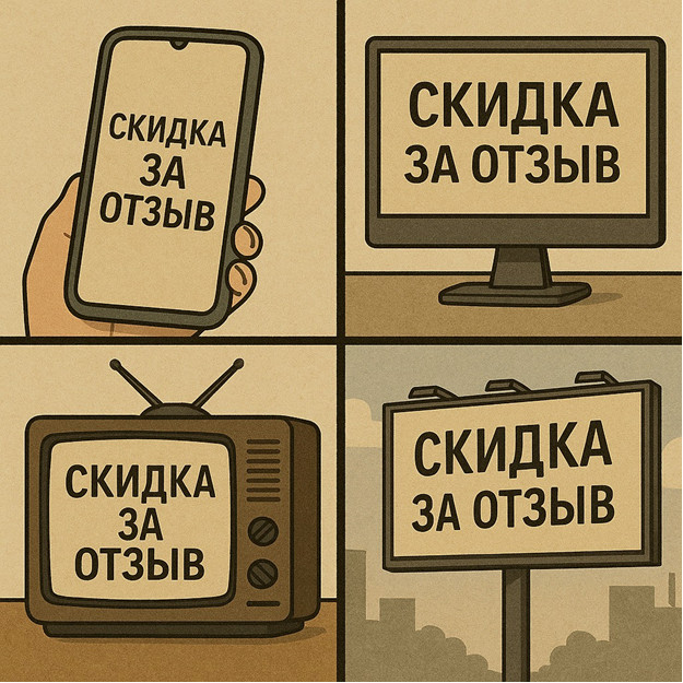 скидочных промокодах за положительные отзывы. Человек оставляет отзыв на сайте с