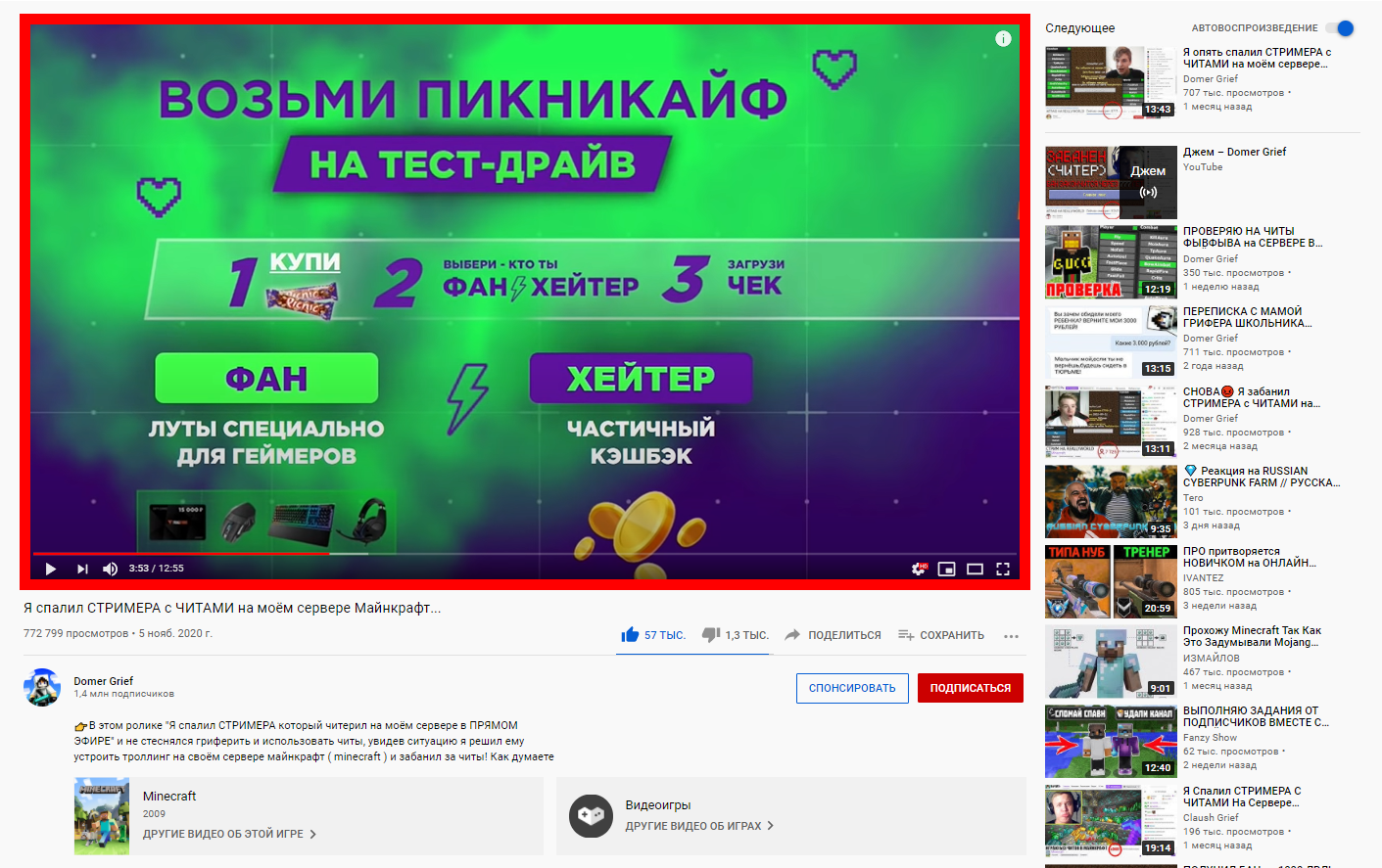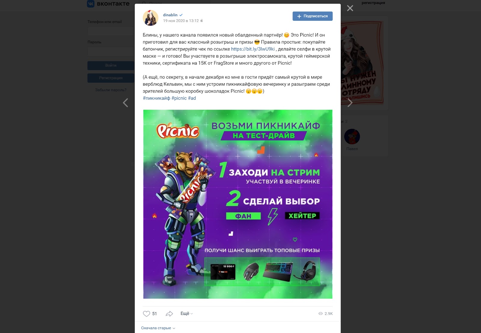 Бренд шоколадных батончиков Picnic запустил большую рекламную кампанию «Возьми пикникайф на тест-драйв!». Амбассадорами которой стали исполнители Mia Boyka и DAVA, снявшие музыкальный клип на песню «Пикник». В рамках проекта бренд продвигал основной сайт акции. При этом для геймерской аудитории была создана отдельная механика с собственным лендингом, которую нужно было продвигать отдельно от основного проекта. Мы решили, что оптимальным вариантом станет интеграция бренда и рекламной кампании в контент популярных русскоязычных игровых стримеров на YouTube и Twitch, так как их аудитория отличается лояльностью и демонстрирует высокую вовлеченностью в рекламные активности.