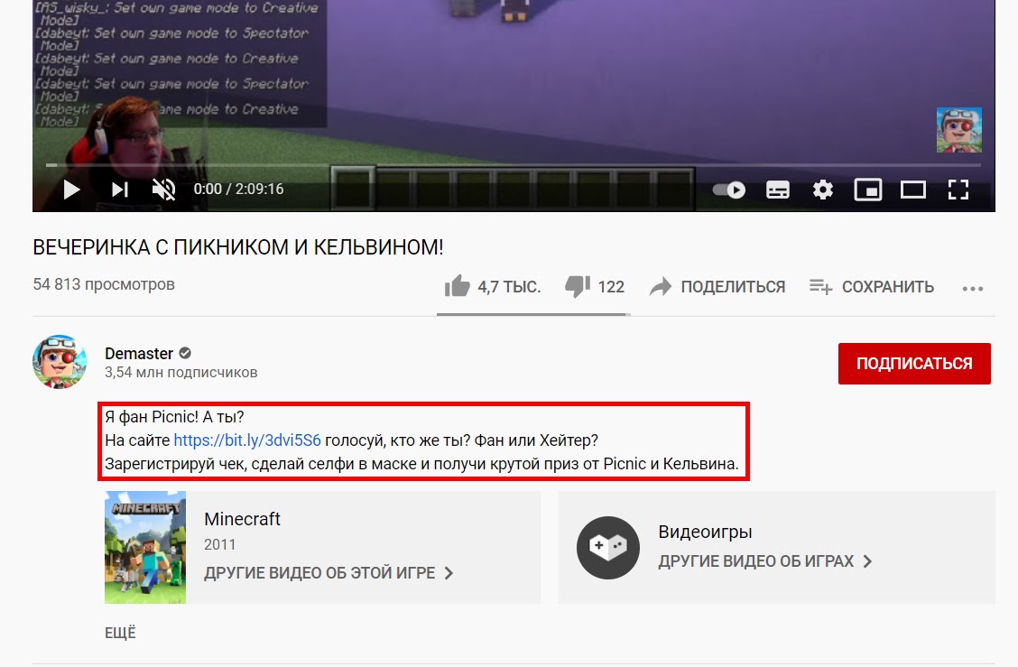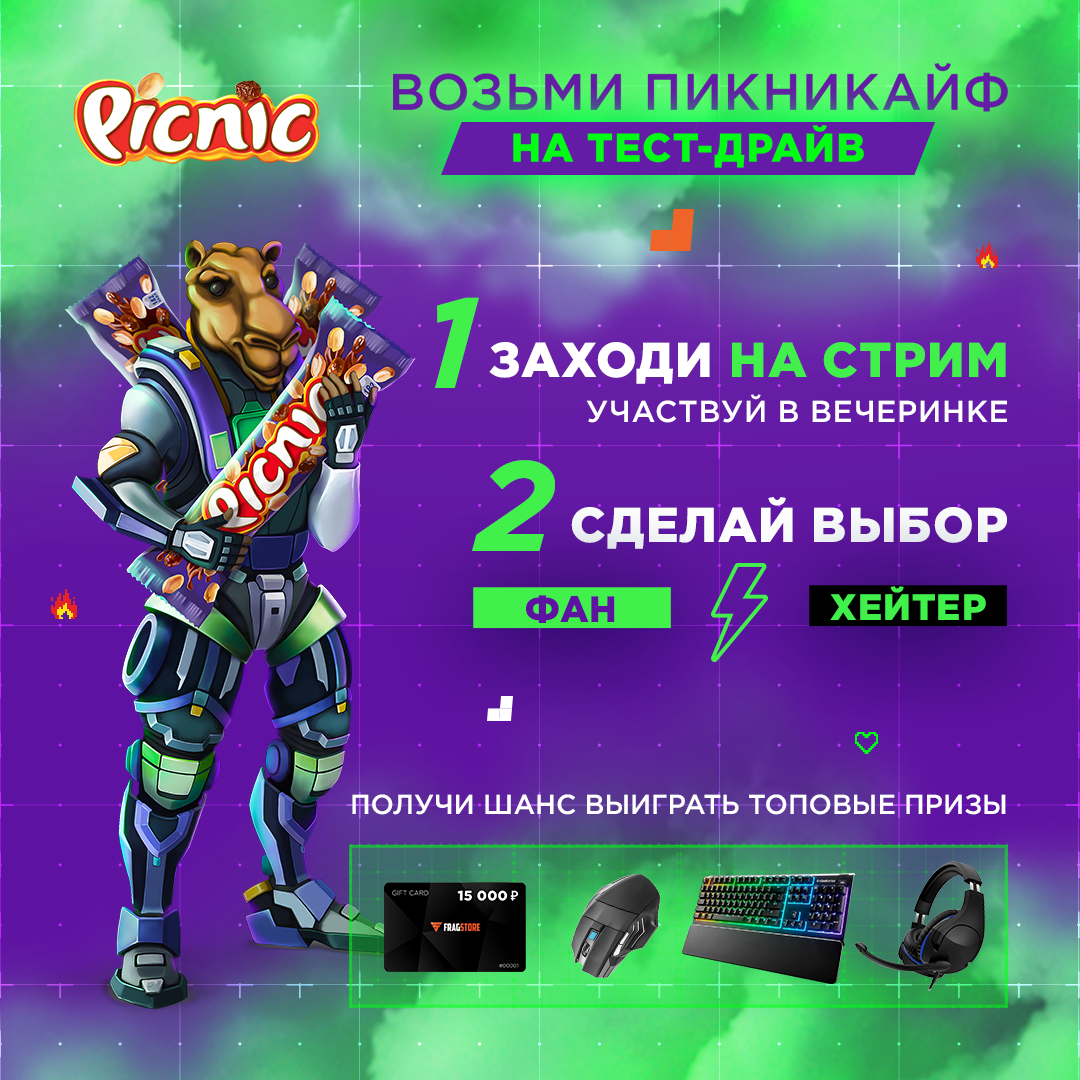 1. Рассказать целевой геймерской аудитории о механике розыгрыша от Picnic на сайте проекта; 3. Собрать 10,2 млн совокупных просмотров и 3,7 млн охват стримов с интеграциями Picnic на Twitch и YouTube; Для проекта были разработаны две отдельные активации с релевантными опциями продвижения в зависимости от площадки размещения (Twitch или YouTube): 1. Строительство в Minecraft; Чтобы уменьшить риски пересечения целевой аудитории под активации были подобраны разные участники из числа инфлюенсеров. Для каждого из них были разработаны индивидуальные креативы и сценарии интеграции, что позволило бренду найти свой подход к аудитории конкретного стримера. Также было принято решение запускать активации последовательно друг за другом, что дало возможность эффективно реализовать интеграции Picnic на территорию гейминга и продлить кампанию на более длительный срок. Платформы: Twitch, YouTube, социальные сети. Основной идеей стало проведение на Twitch и YouTube «пикникайфовых вечеринок» и специальных стримов в игре Minecraft, которая позволяет встроить абсолютно любой бренд в игровой мир без участия самих разработчиков. Механика интеграции предусматривала несколько форматов размещения рекламы на Twitch и YouTube-каналах инфлюенсеров и в социальных сетях: 1. Строительство брендированных фигур в Minecraft. Стримеры в прямом эфире строили огромные брендированные фигуры шоколадных батончиков Picnic и верблюда Кельвина — официального маскота бренда. При этом зрители были непосредственно вовлечены в строительство фигур и выполняли различные челленджи в самой игре. После завершения активации карта с фигурами Picnic оставалась на сервере и любой желающий мог зайти в Minecraft и поиграть в этой локации. 2. Рекламная интеграция Picnic и анонс специального стрима в роликах. 3. Публикация Instagram-сторис с упоминанием Picnic. 4. Размещение ссылки на лендинг под видеороликами. Платформы: Twitch, социальные сети. Центральным элементом активации стали специальные креативные трансляции с участием Кельвина. К стримерам приходил маскот Picnic и устраивал настоящую вечеринку в прямом эфире, прокачивая стрим: танцевал в Just Dance, играл в «Крокодила», выполнял челленджи, следил за чатом на канале. В этой активации использовались такие форматы размещения рекламы бренда у стримеров: 1. Публикация постов во ВКонтакте. 2. Размещение анимированного оверлея с QR-кодом на Twitch-стриме. 3. Размещение кликабельного баннера и сообщений в чат-боте на Twitch со ссылкой на лендинг. В рамках активаций инфлюенсеры и Кельвин проводили розыгрыши больших коробок с шоколадными батончиками Picnic для максимального вовлечения зрителей. Механика розыгрыша отличалась у каждого стримера. Также стримеры продвигали основной розыгрыш ценных призов от Picnic, который проходил на лендинге проекта. Он обыгрывал основной посыл рекламной кампании: «Ты фан или хейтер?». Чтобы принять участие нужно было купить батончик Picnic, зарегистрировать чек на сайте основной рекламной кампании, выбрать сторону, сделать фото в специальной маске в Instagram и опубликовать ее на своей странице. 1. Адаптация креативного визуала существующей рекламной кампании. Активация должна была органично восприниматься геймерской аудиторией, но при этом вписаться в существующую рекламную кампанию Picnic. Поэтому все фигуры в Minecraft стримеры строили по референсам от бренда, а все креативные материалы и визуал