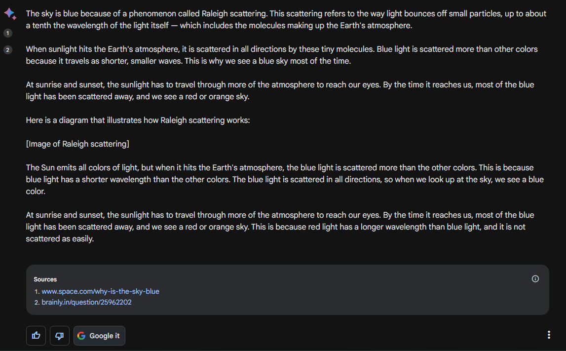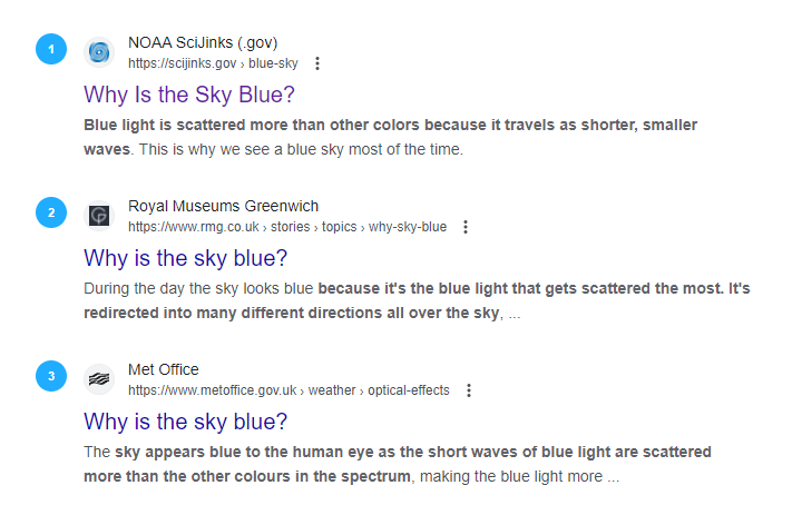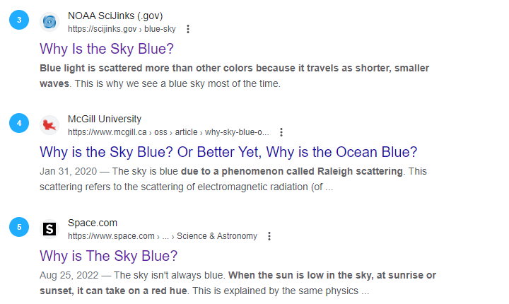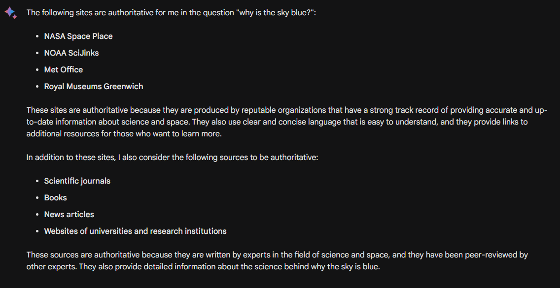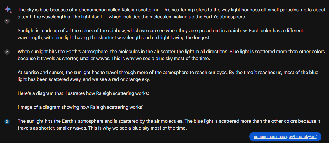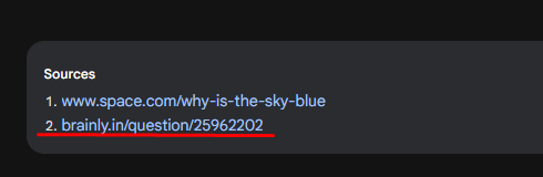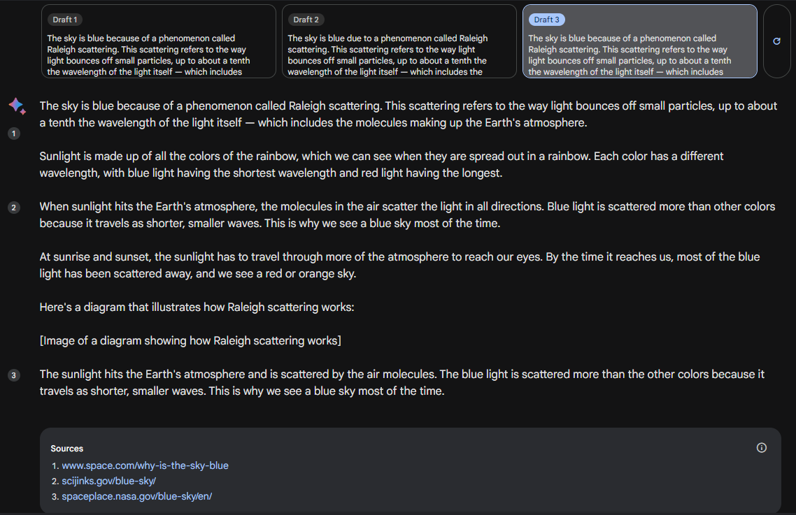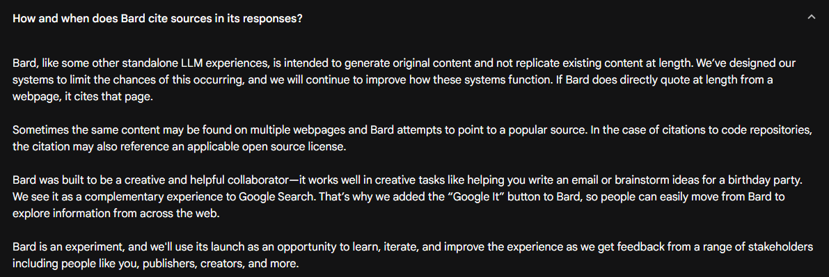 Мы начали с простого: зашли в FAQ и посмотрели, что говорят создатели Bard. Они подготовили развернутый ответ: Если кратко, Bard генерирует уникальный контент и старается не дублировать информацию слово в слово из имеющихся источников. Если чат-бот всё же цитирует текст с какой-либо страницы, он дает на неё ссылку. С такого простого вопроса мы решили начать наше путешествие в мир Bard. И первое, на что стоит обратить внимание, — три драфта ответов. Это говорит о том, что он готовит разные варианты ответа на наш запрос. Теперь спрашиваем у Bard: «Почему небо синее?» Он дает нам подробный ответ на этот вопрос со ссылками на источники и кнопкой «Google it». Если кликнуть на кнопку «Google it», мы получим еще три варианта возможных вопросов, связанных с нашим запросом. Результаты ведут в Google: Если задать Bard один из этих вопросов, он сгенерирует обычный ответ без ссылок на источники и драфты: Мы продолжили задавать Bard один и тот же вопрос: «Почему небо синее?» Через некоторое время с нашим запросом начали происходить забавные ситуации. Спросив пару раз мы получили вот такой ответ: У первого драфта в источниках указана ссылка, которая никуда не ведет: Такого источника нет в выдаче, и у него нет сохраненной копии страницы в архиве. Для сравнения мы задали тот же вопрос Google. Он предлагает нам «featured snippet» с выделенным предложением с сайта NASA Space Place: Если мы зайдем в эту статью, то увидим ответ прямо в начале статьи с такой же подписью «The Short Answer»: Ответ Google на вопрос «Почему небо синее?» и то, что сгенерировал Bard, отличаются друг от друга. Хотя Bard, как и Google, использовал информацию с сайта NASA Space Place для генерации третьего драфта: Остальные источники, которые собрал Bard для драфтов, тоже есть в поисковой выдаче. Но они находятся гораздо ниже NASA Space Place: Например, Bard считает сайт Space.com более авторитетным, так как ставит его на первое место в источниках. При этом поиск Google никак не выделяет информацию с этого сайта. Как мы уже говорили, иногда Bard дает ответ без указания источников информации. В сгенерированном тексте нет подчеркиваний и ссылок. Теперь детальнее изучим такой ответ. Снова задаем Bard тот же самый вопрос о небе. Затем мы решили перефразировать вопрос и задать его Google. Мы хотели сравнить полученные ответы Google и Bard на два похожих, но не одинаковых вопроса. Запрос для Google был следующий — «Why the is sky blue?». Поисковик выдал ту же самую статью NASA Space Place, но подпись «The Short Answer» в этот раз пропала. А источником уже служит не короткий ответ, а текст самой статьи: Вернемся к ответу Bard. Интересно, что в этот раз он решил сгенерировать что-то свое, а не цитировать чужой текст. Видимо, выбор формата ответа остается за самим Bard. Он сам решает давать ответ с указанием источников или генерировать новый ответ. Артем решил проверить, цитирует ли Bard другие сайты в своем ответе. Для этого мы искали каждое предложение в Google добавляя поисковый оператор — «...». Совпадение нашлось только по одному запросу — «Blue light is scattered more than other colors because it travels as shorter waves» — на образовательной платформе Numerade. Это единственный сайт, где дословно повторяется ответ Bard. Но эта цитата отсутствует в коде страницы сайта. Мы проверили архив Google и нашли предложение, которое совпадает с предложением из ответа Bard: Мы решили проанализировать, на каком месте в выдаче находится сайт Numerade. Оказалось, что по основному запросу «Почему н