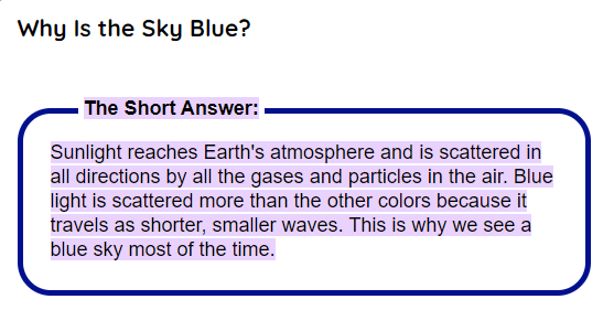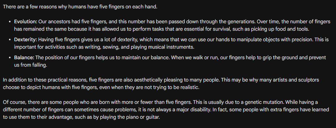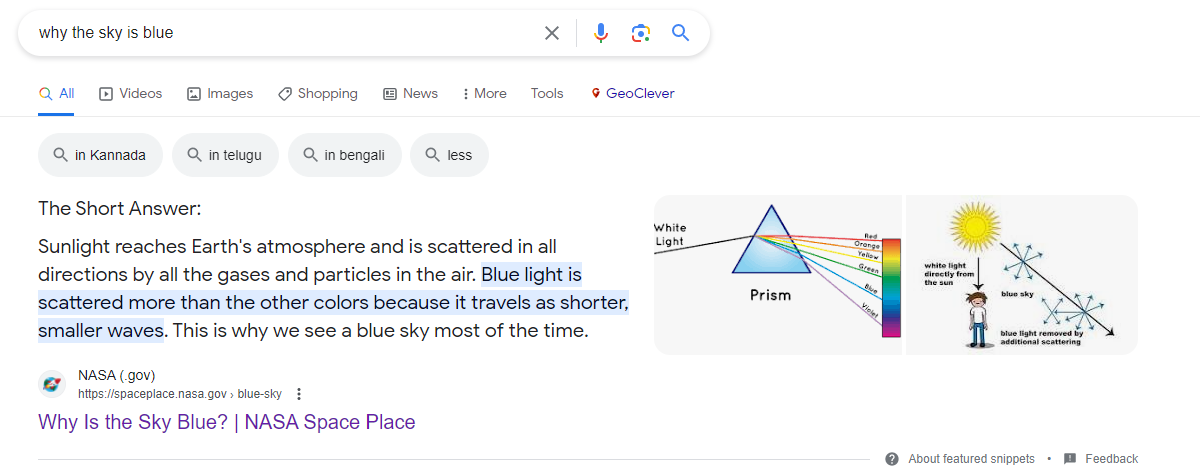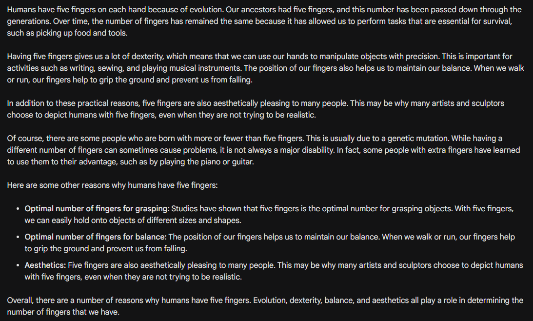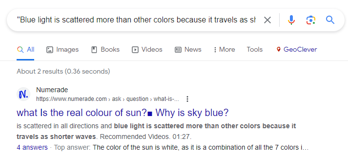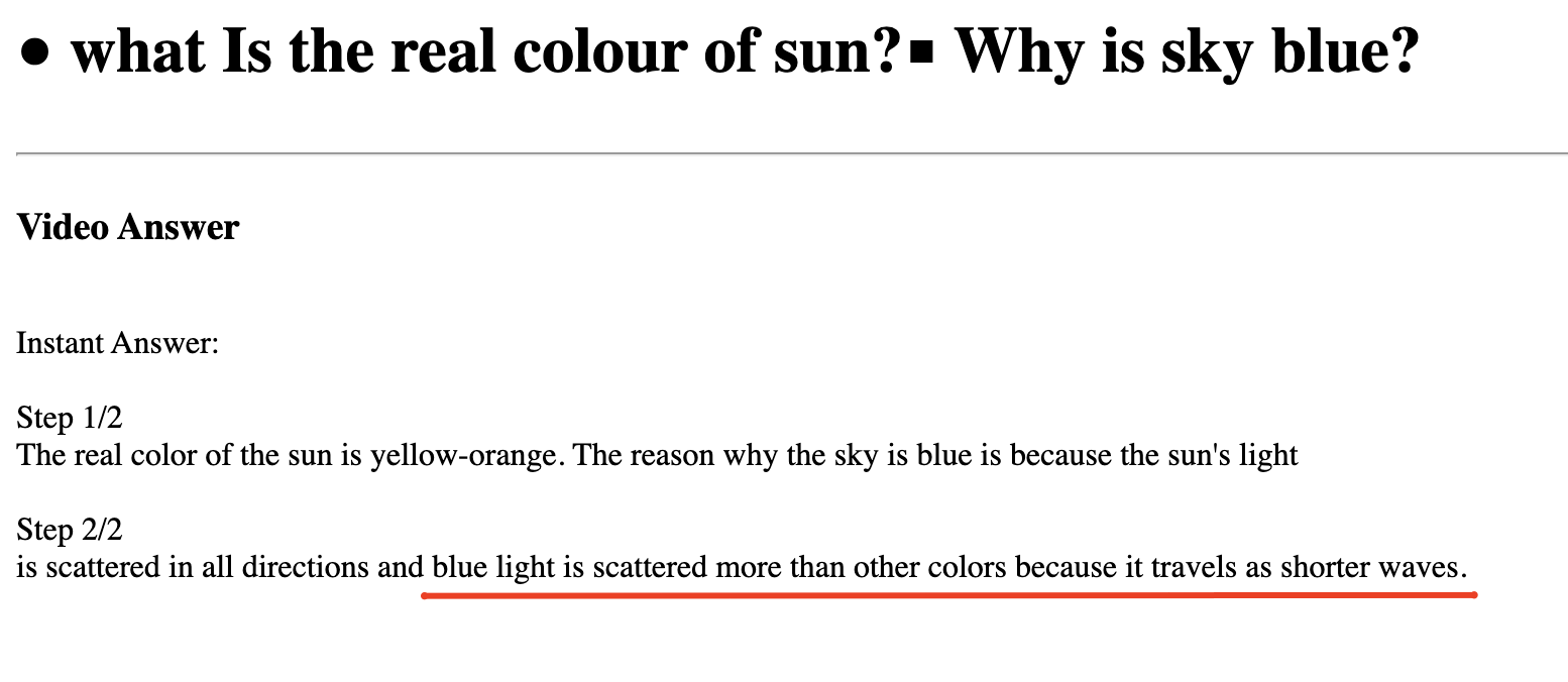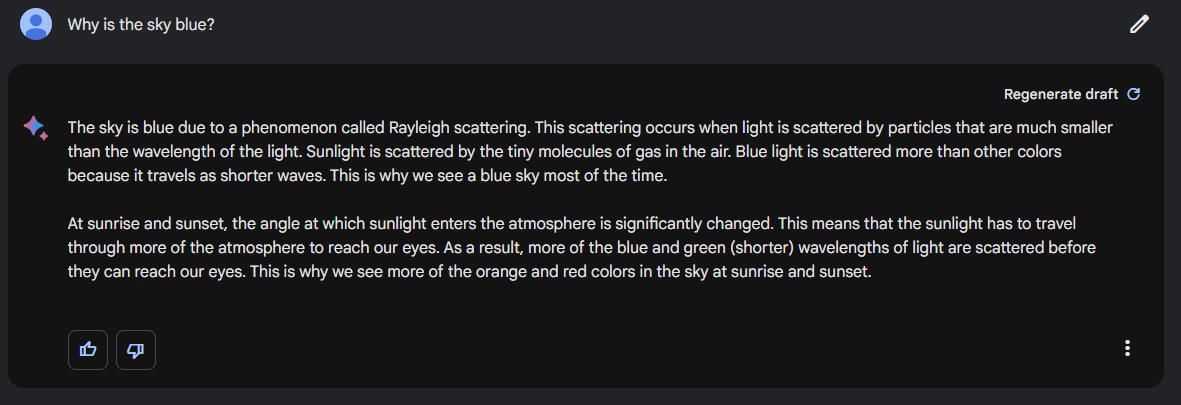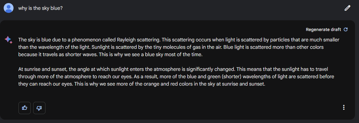 Мы начали с простого: зашли в FAQ и посмотрели, что говорят создатели Bard. Они подготовили развернутый ответ: Если кратко, Bard генерирует уникальный контент и старается не дублировать информацию слово в слово из имеющихся источников. Если чат-бот всё же цитирует текст с какой-либо страницы, он дает на неё ссылку. С такого простого вопроса мы решили начать наше путешествие в мир Bard. И первое, на что стоит обратить внимание, — три драфта ответов. Это говорит о том, что он готовит разные варианты ответа на наш запрос. Теперь спрашиваем у Bard: «Почему небо синее?» Он дает нам подробный ответ на этот вопрос со ссылками на источники и кнопкой «Google it». Если кликнуть на кнопку «Google it», мы получим еще три варианта возможных вопросов, связанных с нашим запросом. Результаты ведут в Google: Если задать Bard один из этих вопросов, он сгенерирует обычный ответ без ссылок на источники и драфты: Мы продолжили задавать Bard один и тот же вопрос: «Почему небо синее?» Через некоторое время с нашим запросом начали происходить забавные ситуации. Спросив пару раз мы получили вот такой ответ: У первого драфта в источниках указана ссылка, которая никуда не ведет: Такого источника нет в выдаче, и у него нет сохраненной копии страницы в архиве. Для сравнения мы задали тот же вопрос Google. Он предлагает нам «featured snippet» с выделенным предложением с сайта NASA Space Place: Если мы зайдем в эту статью, то увидим ответ прямо в начале статьи с такой же подписью «The Short Answer»: Ответ Google на вопрос «Почему небо синее?» и то, что сгенерировал Bard, отличаются друг от друга. Хотя Bard, как и Google, использовал информацию с сайта NASA Space Place для генерации третьего драфта: Остальные источники, которые собрал Bard для драфтов, тоже есть в поисковой выдаче. Но они находятся гораздо ниже NASA Space Place: Например, Bard считает сайт Space.com более авторитетным, так как ставит его на первое место в источниках. При этом поиск Google никак не выделяет информацию с этого сайта. Как мы уже говорили, иногда Bard дает ответ без указания источников информации. В сгенерированном тексте нет подчеркиваний и ссылок. Теперь детальнее изучим такой ответ. Снова задаем Bard тот же самый вопрос о небе. Затем мы решили перефразировать вопрос и задать его Google. Мы хотели сравнить полученные ответы Google и Bard на два похожих, но не одинаковых вопроса. Запрос для Google был следующий — «Why the is sky blue?». Поисковик выдал ту же самую статью NASA Space Place, но подпись «The Short Answer» в этот раз пропала. А источником уже служит не короткий ответ, а текст самой статьи: Вернемся к ответу Bard. Интересно, что в этот раз он решил сгенерировать что-то свое, а не цитировать чужой текст. Видимо, выбор формата ответа остается за самим Bard. Он сам решает давать ответ с указанием источников или генерировать новый ответ. Артем решил проверить, цитирует ли Bard другие сайты в своем ответе. Для этого мы искали каждое предложение в Google добавляя поисковый оператор — «...». Совпадение нашлось только по одному запросу — «Blue light is scattered more than other colors because it travels as shorter waves» — на образовательной платформе Numerade. Это единственный сайт, где дословно повторяется ответ Bard. Но эта цитата отсутствует в коде страницы сайта. Мы проверили архив Google и нашли предложение, которое совпадает с предложением из ответа Bard: Мы решили проанализировать, на каком месте в выдаче находится сайт Numerade. Оказалось, что по основному запросу «Почему н