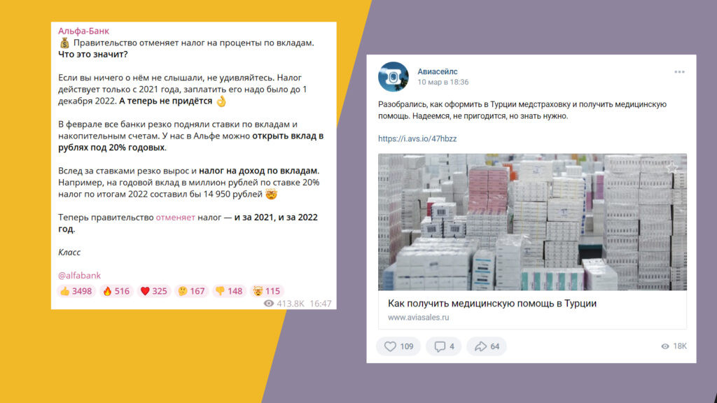 Публикация постов ещё не значит, что вы делаете всё «как надо». Сейчас мы видим в соцсетях компаний много неадаптированного контента. Кто-то разыгрывает бьюти-боксы, кто-то активно призывает покупать флагманскую технику или туры на Мальдивы. Конечно, нет продуктов, которые сейчас продавать нельзя, но мотивы и ценности к покупкам, надо признать, у пользователей изменились. От чего стоит отказаться при подготовке контента: Единственный тип контента, который сейчас актуален и не вызывает волну хейта — полезный. Это экспертные материалы, с помощью которых вы можете помочь вашей аудитории справиться с ситуацией. Цель полезных постов — решить проблемы ваших подписчиков, помочь сориентироваться в быстро меняющихся условиях. Они помогут бренду решить сразу две задачи: Облегчить жизнь ваших читателей и решить некоторые их проблемы можно с помощью: Учтите, что контент должен быть напрямую связан со сферой, в которой вы работаете: демонстрируйте экспертность, в чём вы разбираетесь. Например, Альфа Банк в своём Telegram-канале рассказывает о том, как будут применяться новые постановления правительства, а Авиасейлс делится инструкциями для тех, кто планирует релокацию. Пандемия, с которой мы столкнулись два года назад, для брендов стала тренировкой к сегодняшней реальности. Тогда мы заново учились выстраивать коммуникацию с подписчиками: в словарь SMM-специалистов вошло понятие «новая искренность», когда бренд говорит со своей аудиторией честно, ничего не утаивая. В этом году ситуация серьёзнее, однако новая искренность снова поможет брендам сохранить или наладить отношения с аудиторией. Расскажите, как обстоят дела в вашей компании прямо сейчас: как повлияла на вас геополитическая ситуация и санкции, какие проекты вы замораживаете, а какие продолжаете развивать. Открытость и честность — то, чего сейчас не хватает аудитории соцсетей: дайте им возможность получать достоверную информацию, которая может помочь сориентироваться в неспокойное время. Если вы сомневаетесь, какой контент будет уместен — спросите у аудитории, что бы они хотели услышать от вас прямо сейчас, какие советы помогут им решить проблемы. Опрос поможет вам одновременно: Не забывайте об обратной связи: отвечайте на комментарии, задавайте вопросы. Подписчикам важно знать, что бренд не оставил их один на один со сложной ситуацией, он рядом и готов помогать любыми способами. Для этого компания ведь и приходит в социальные сети — чтобы вести доверительный разговор со своими подписчиками, строить лояльное комьюнити. В сегодняшних реалиях делать вид, что ничего не происходит, и постить контент по согласованному в январе плану, компаниям не получится. Мир изменился и продолжает меняться, и задача бренда в этих условиях — адаптироваться, а не настаивать на том, что всё идёт «как обычно». Аудитории не нужны рецепты блинчиков и новые ароматы гелей для душа: им нужны полезные посты, которые смогут решить их проблемы прямо сейчас. Поэтому финальный совет будет звучать так: адаптируйте, адаптируйтесь и прислушивайтесь к своей аудитории.