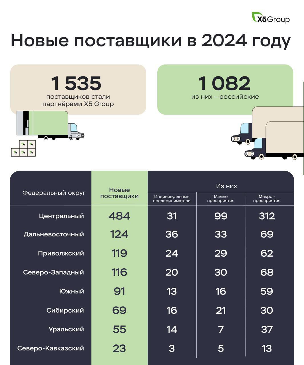 Всего на полках торговых сетей Х5 на конец 2024 года была представлена продукция 7429 поставщиков.
