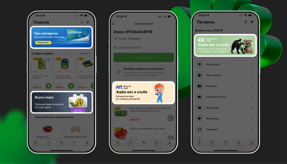 Для этого X5 Media запустил сразу пять click-out форматов. Разместить свое предложение бренды смогут на двух баннерах на главной странице приложения, в stories, а также на баннерах в составе заказа и профиле пользователя.
