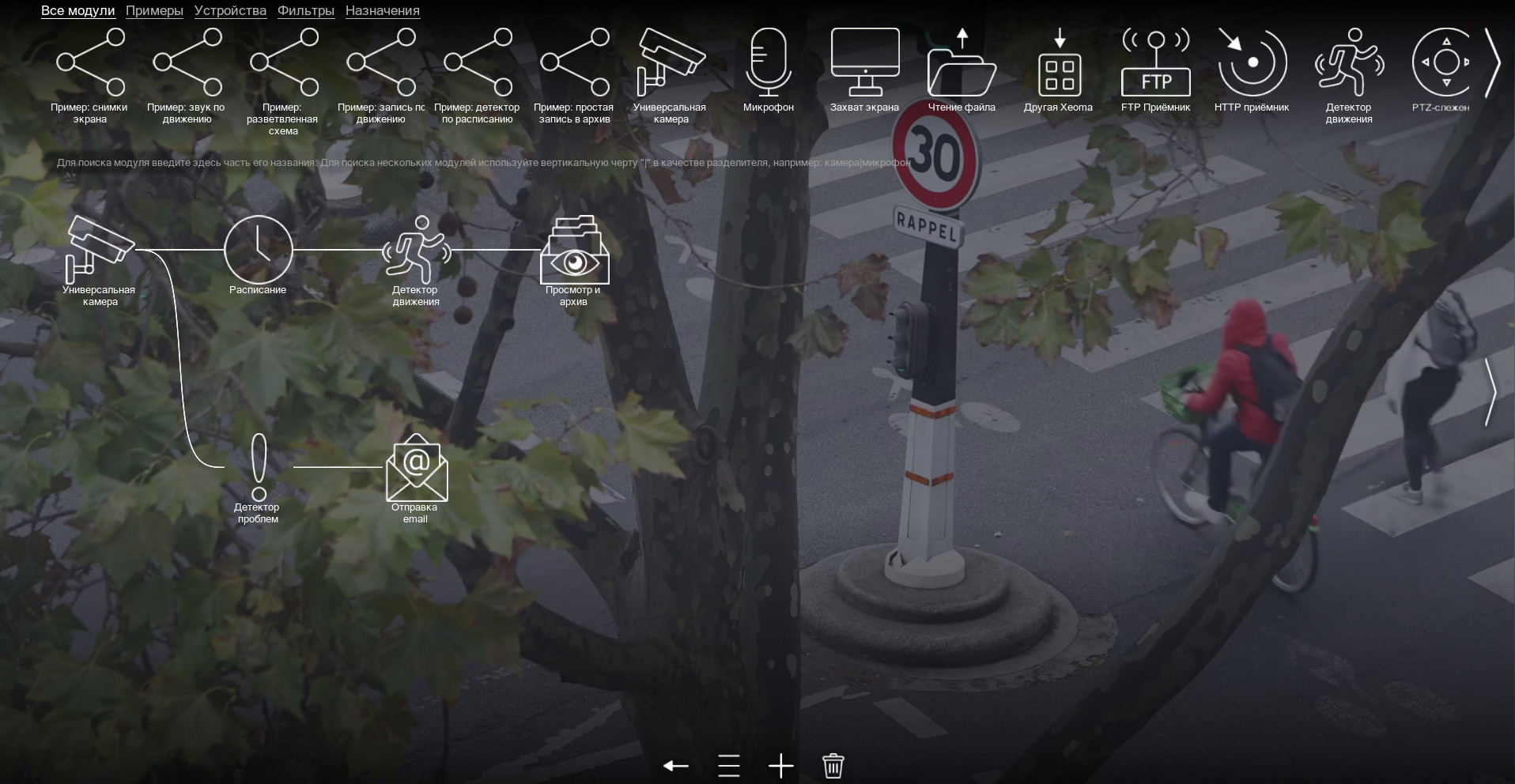 сайта Xeoma (есть бесплатное тестирование любых функций). 2. Запустите Xeoma прямо из скачанного файла. 3. Добавьте камеры с помощью кнопки + на экране Xeoma любым удобным способом 4. Используйте программу с настроенными по умолчанию цепочками на запись архива по движению либо настройте функции под свои нужды: