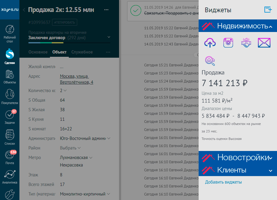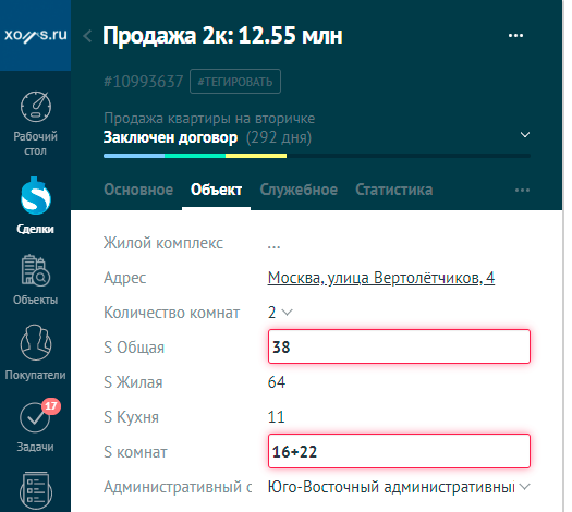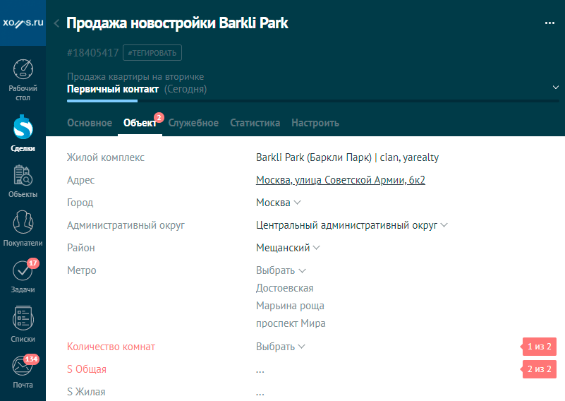 При этом важно при настройки системы учесть, что одни и те же поля могут иметь разные типы. Например, поле «Количество комнат», при продаже, может иметь только одно значением, для двухкомнатной квартиры это будет «2». В тоже время, при покупке квартиры, потребность у клиента будет «2-х» или «3-х» квартиры. Соответственно должна быть возможность ввода более одного значения (множественный выбор). Бывает, что в силу человеческого фактора, пользователь может ввести неверные данные, которые имеют критическое значение. Например, если при вводе площадей квартиры, пользователь ошибся и указал общую площадь, которая меньше суммы жилой и кухни, то виджет Xoms мягко сообщит об ошибке. При работе с полями, который имеют определенный формат ввода, удобно использовать шаблон ввода. Данные при этом легко читаются и система не позволит ввести лишние символы. Это особенно заметно при вводе кадастрового номера, в котором, в котором легко ошибиться из-за большого количества цифр. Важным полем является «Адрес». Корректное заполнение данного поля критически важно при выгрузки объекта на доски объявлений или при поиске подходящих встречных объектов.При вводе адреса, виджет Хомс подсказывает пользователю несколько вариантов возможных адресов. Нажав на нужный вариант, адрес подставиться в соответствующее поле. Автоматически заполнятся поля: Город, Административный округ; Район и появится подсказка с тремя ближайшими станция метро возле поля «Метро». Нажав на нужную станцию, она автоматически добавиться в поле.Указанный адрес легко посмотреть на карте. Нажав на кнопку «Посмотреть на карте», откроется Google карта с указанием нашего объекта.Вот так просто пользователь заполнит адрес.Важное преимущество! Все поля заполняются в едином формате всеми пользователями, что повышает качество данных и удобство восприятия менеджером. В дальнейшем это повысит точность подбора объектов и показатели статистики. Если вы продаете квартиру в новостройке, при вводе названия жилого комплекса система автоматически предложит несколько вариантов ЖК с таким названием. После выбора нужной новостройки автоматически заполнятся все адресные поля. А при выгрузке квартиры на доски объявлений, она автоматически будет добавлена в указанный жилой комплекс на данном сайте. После ввода адреса, виджет Хомс Недвижимость подскажет рекомендуемую стоимость продажи объекта и диапазон цен на аналогичную недвижимость на рынке. Если при заполнении карточки, пользователь забыл заполнить какое-то важное поле, то при сохранении сделки, amoCRM обязательно напомнит об этом и все важные данные будут зафиксированы в crm-системе.