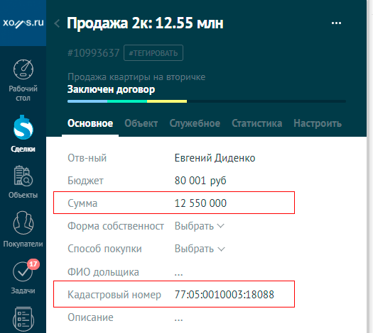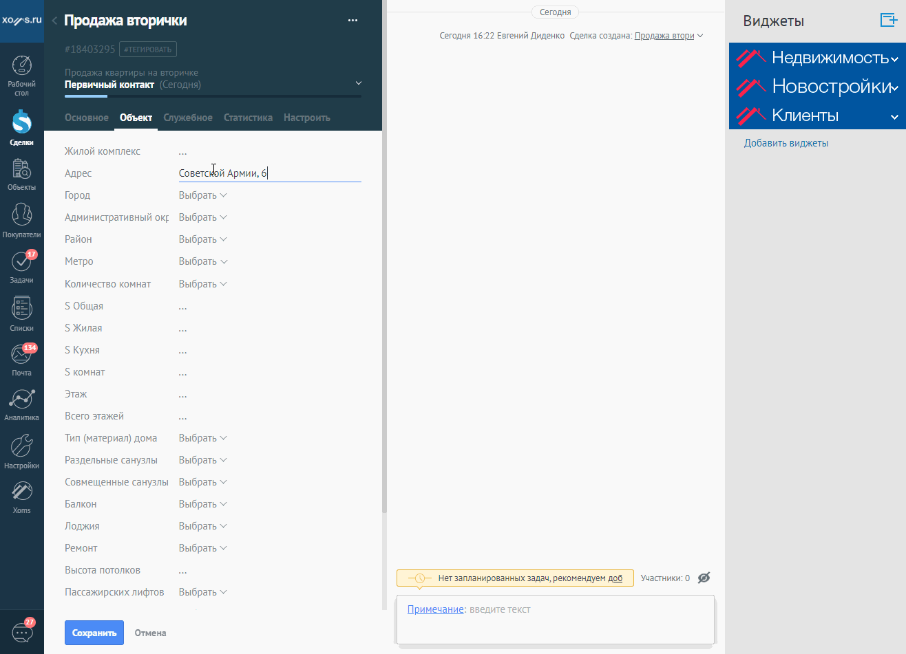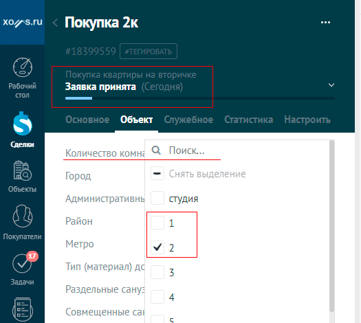 Риэлтор уточняет за какой услугой обратился клиент. Выбрав соответствующую воронку продаж, система с помощью виджетов Xoms отобразит только те поля, которые необходимы для данного бизнес процесса.