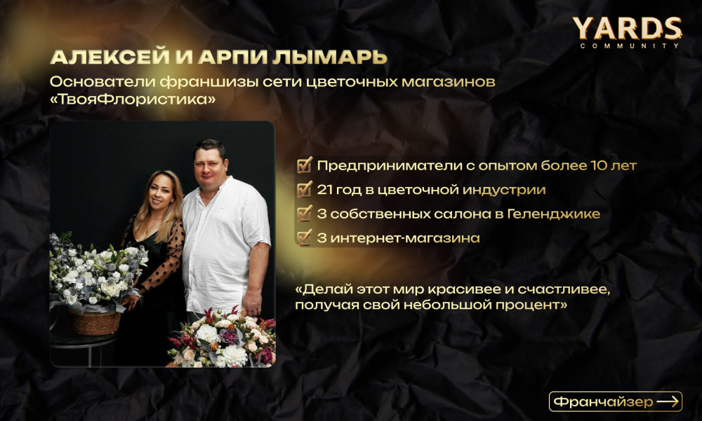 Цветочный бизнес часто воспринимают как локальный проект — салон у дома, который работает для своего города. Однако всё больше предпринимателей рассматривают эту нишу как основу для масштабируемой модели. Один из таких примеров — семейный бизнес Алексея и Арпи Лымарь, основателей сети цветочных магазинов «ТвояФлористика» из Геленджика.