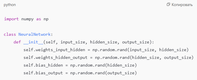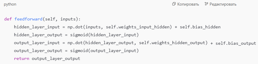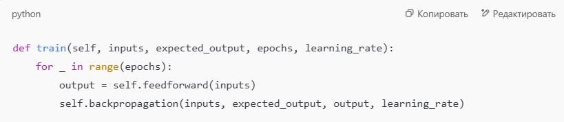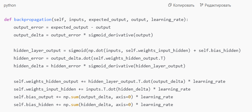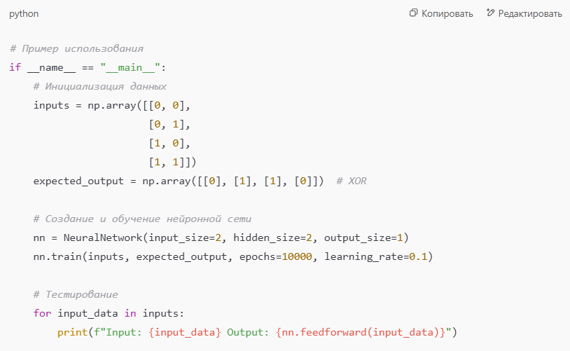 Для начала убедитесь, что у вас установлен Python версии 3.5 или выше и менеджер пакетов pip. Установите библиотеку NumPy, выполнив команду: NumPy предоставляет эффективные инструменты для работы с массивами и матрицами, что необходимо для реализации нейронных сетей. Создадим класс NeuralNetwork, который будет представлять нашу нейронную сеть: Здесь мы инициализируем веса и смещения случайными значениями. Функция активации определяет, будет ли нейрон активирован. Одной из популярных функций является сигмоида: Сигмоида преобразует входное значение в диапазон от 0 до 1, что удобно для моделирования вероятностей. Реализуем метод прямого распространения, который вычисляет выходные значения сети на основе входных данных: Обратное распространение используется для обновления весов на основе ошибки предсказания: Создадим метод для обучения сети на основе предоставленных данных: После обучения модели важно проверить ее работу на новых данных: Создание собственной нейронной сети с нуля позволяет глубже понять внутренние механизмы работы моделей машинного обучения. Освоив базовые концепции, вы сможете переходить к более сложным архитектурам и использовать специализированные библиотеки, такие как TensorFlow или PyTorch, для разработки и обучения продвинутых моделей. Для более подробного изучения темы рекомендуется ознакомиться с дополнительными ресурсами и практическими примерами.