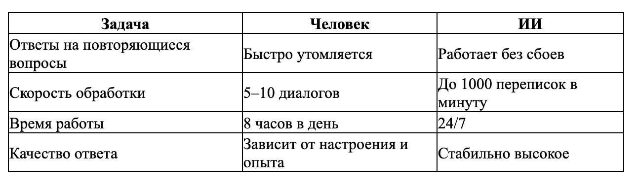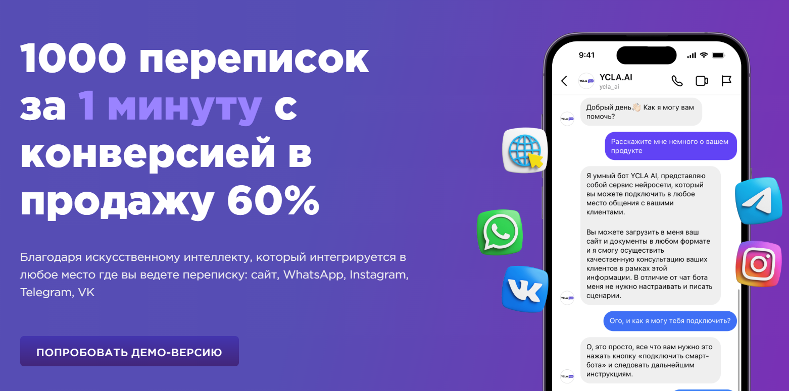 ИИ — это система, способная учиться, адаптироваться и понимать контекст. Нейросети для продаж не просто повторяют шаблон — они анализируют смысл запроса, подбирают индивидуальный ответ и ведут диалог так, чтобы привести к цели: покупке или записи. Преимущества ИИ: ИИ — это не автоматизация в привычном смысле, а интеллектуальный ассистент, который думает и действует, как живой менеджер, но быстрее, точнее и без усталости. Менеджеры по продажам — ценный ресурс, но у них есть ограничения. Они устают, болеют, отвлекаются, путают данные, забывают задачи. Сравнение: ИИ не заменяет человека полностью — но он забирает на себя рутину, оставляя сотрудникам сложные, нестандартные случаи. YCLA AI — это мощный инструмент на базе ИИ, который не просто автоматизирует, а переосмысляет процесс продаж. Его возможности выходят далеко за рамки обычных чат-ботов: YCLA AI — это не шаблон. Он реально заменяет менеджера в переписке, при этом звучит естественно и понятно для клиента. Интеграция YCLA AI занимает пару минут и не требует программиста: Благодаря гибкой архитектуре, YCLA AI легко встраивается в существующую систему и быстро начинает приносить результат. Разница между ИИ и классической автоматизацией — как между калькулятором и помощником. Первый просто считает, второй — думает, понимает, предлагает решение. Нейросети для продаж сегодня — это реальный способ увеличить прибыль, улучшить клиентский сервис и освободить менеджеров от рутинной работы. YCLA AI показывает, как современные технологии могут не просто помогать, а заменять устаревшие подходы, включая шаблонные чат-боты и скрипты. Если вы хотите быть впереди конкурентов — начните с внедрения YCLA AI уже сейчас.