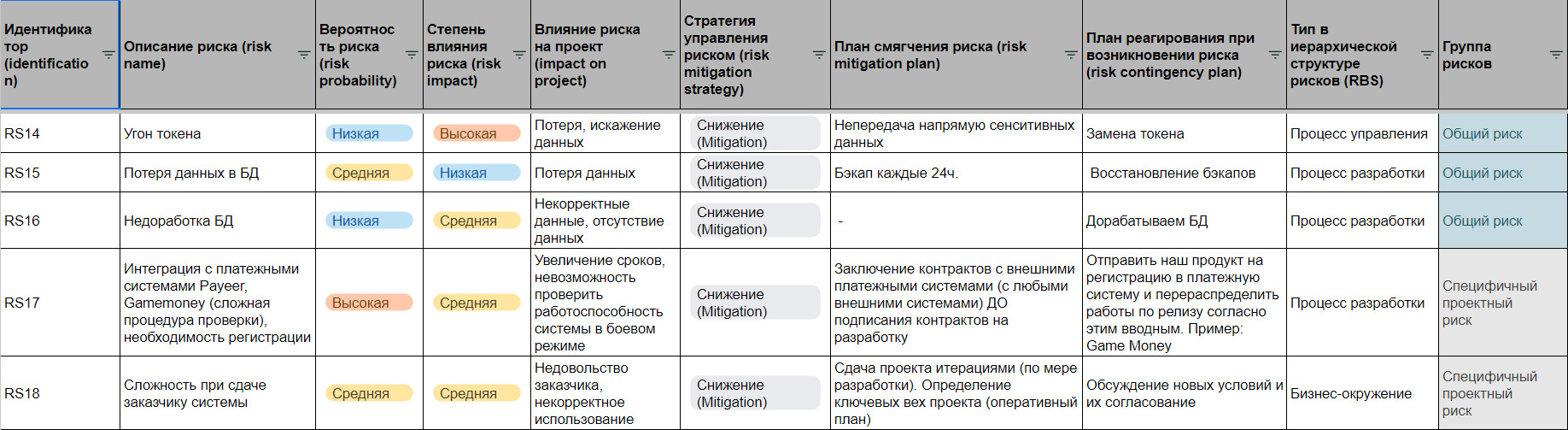 Мы составляем реестр, который включает общие и специфичные для проекта риски, а также стратегии управления и план реагирования при их наступлении. Этот документ очень важен — проект стартует только тогда, когда обе стороны его согласуют и подпишут. На следующих этапах работы реестр может по необходимости пересматриваться и актуализироваться.