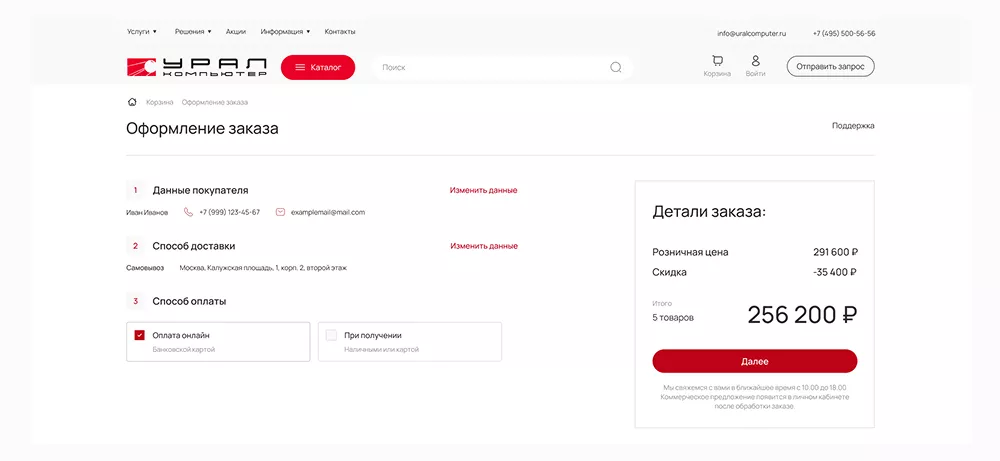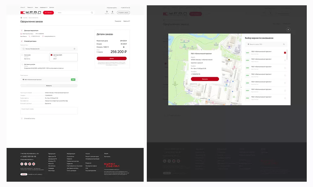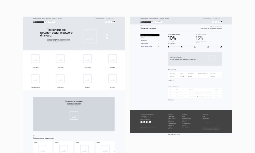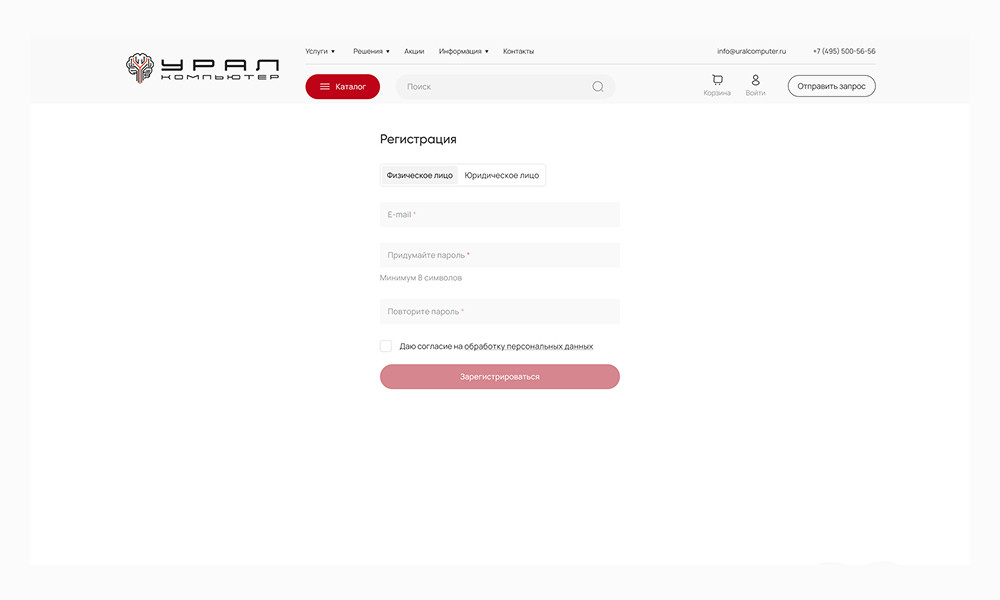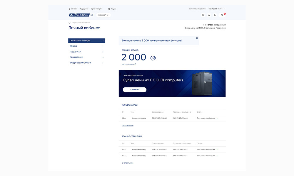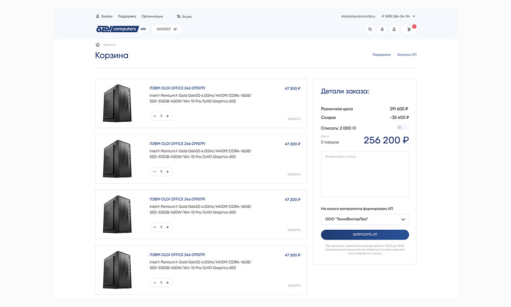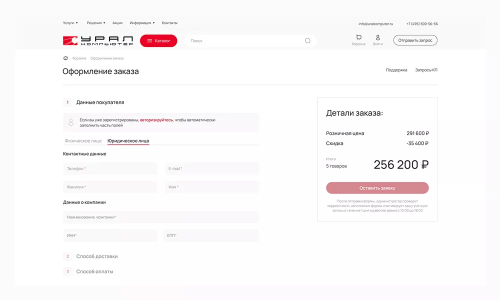 ТЗ получено, стали думать над тем, как при помощи структуры и функциональности сделать сайт максимально удобным для оптовых покупателей. Но что именно нужно этой аудитории? Какими инструментами они действительно будут пользоваться? Ответы на эти вопросы легли в основу разработки прототипов. Сам сайт требовалось разработать на 1C-Битрикс. Чтобы создать действительно полезный инструмент, погрузились в основные потребности оптовых покупателей. Выделили ключевые функции: Интересный момент: начальный вид сайта представлял собой всего лишь окно для входа. Звучит просто, но это было не случайным решением. Такой подход позволил проверить важнейшую гипотезу: готовы ли оптовые клиенты регистрироваться и ждать одобрения на доступ. Сначала клиент видит форму для входа с предложением отправить заявку на доступ. В заявке клиент указывает информацию о компании, контактные данные и юридическую информацию. Эти данные проверяются менеджером. Если заявка одобрена, на почту клиента отправляется письмо с логином и паролем для входа. Зачем такие сложности: Изначально планировали сделать сайт с главной страницей, на которой привычно бы отображались баннер, основные категории товаров, акции и прочее. Но позже решили, что для юрлиц важнее сразу показать каталог товаров и обеспечить быстрый вход в личный кабинет. Сосредоточились на удобстве шапки сайта, куда были выведены основные разделы и вход в ЛК, а также на «Каталоге продукции». Так как продуктом является компьютерная техника, для удобства поиска нужной позиции обязательно включили поиск по характеристикам. В карточке товара сделали отображение розничной цены, чтобы покупатель сразу мог оценить свою выгоду как Партнер. Оформление заказа по классике через корзину, куда клиент добавляет нужные позиции, видит скидку при статусе Партнера. Ключевой момент здесь — выбор контрагента, для которого будет сформировано КП. После нажатия менеджер обрабатывает заявку, выставляет коммерческое предложение. Все действия по заказу фиксируются в Личном кабинете. Небольшая вишенка для Партнера — это возможность оплатить часть покупки накопленными баллами (об этом ниже). Для такого портала требовалась тщательная проработка личного кабинета, так как именно он решал сразу несколько задач клиента (разгрузка отдела продаж, увеличение объема заказов, повышение лояльности и т.д.). Сделали ЛК максимально простым, интуитивно понятным и с удобным интерфейсом. Общая информация в ЛК — это небольшой дашборд, куда выводится информация по накопленным баллам, текущим акциям, заказам и обращениям. Позже была добавлена информация о личном менеджере прямо под меню для быстрого доступа. В подразделе «Заказы» и «Поддержка» вывели информативные таблицы, чтобы не совершать лишние переходы в сам заказ. На странице с заказом хранятся все документы (коммерческие предложения, акты выполненных работ и другое). Согласовали дизайн, выкатили сайт, приступили к тестированию. И вот на завершающем этапе приходит новая вводная информация от заказчика. Произошло слияние двух мощных компаний, которые до этого были известны на рынке, как Урал Звук и OLDI Computers. И вот, мы стали свидетелями того, как в результате появился УРАЛ КОМПЬЮТЕР, которому требовалась платформа как для бизнеса, так и для частных клиентов. А это означало, что нужн