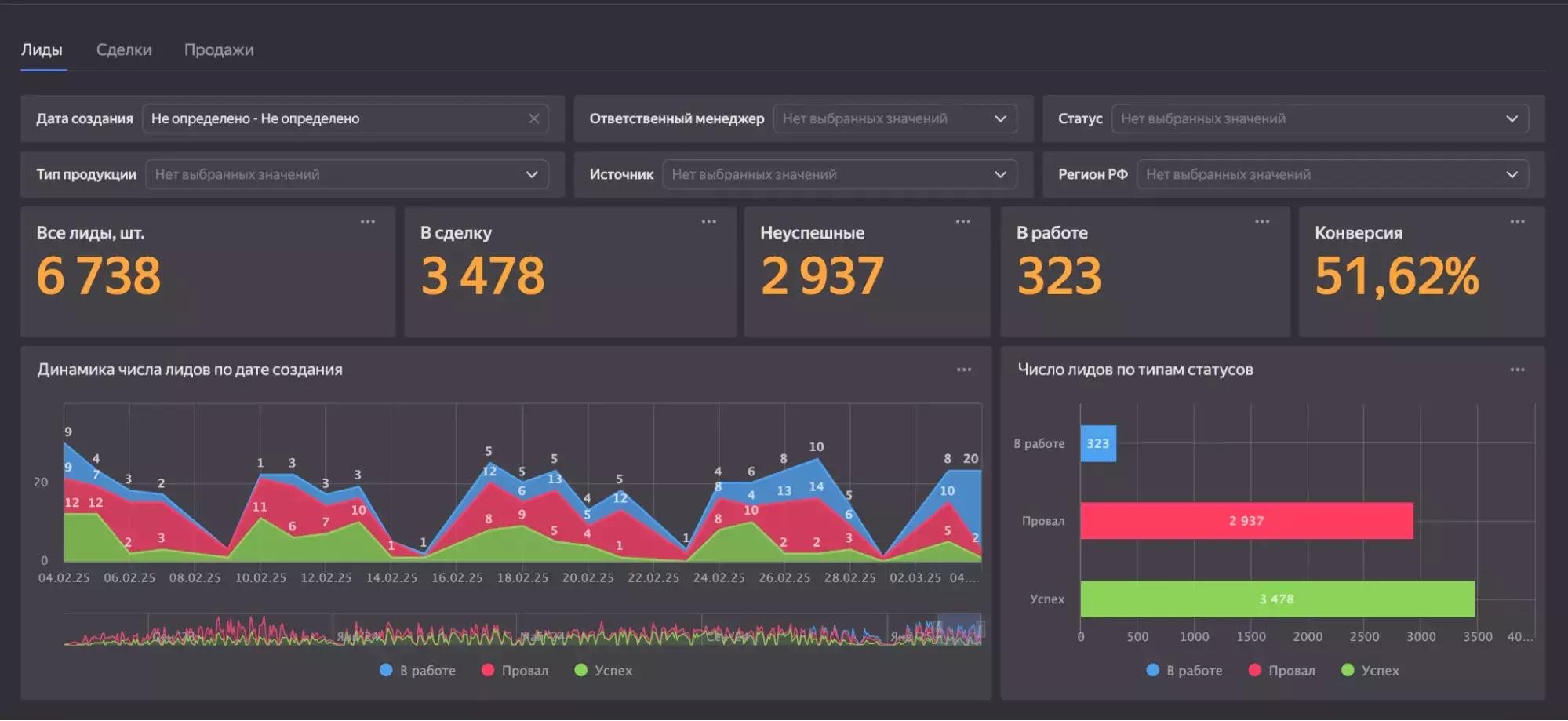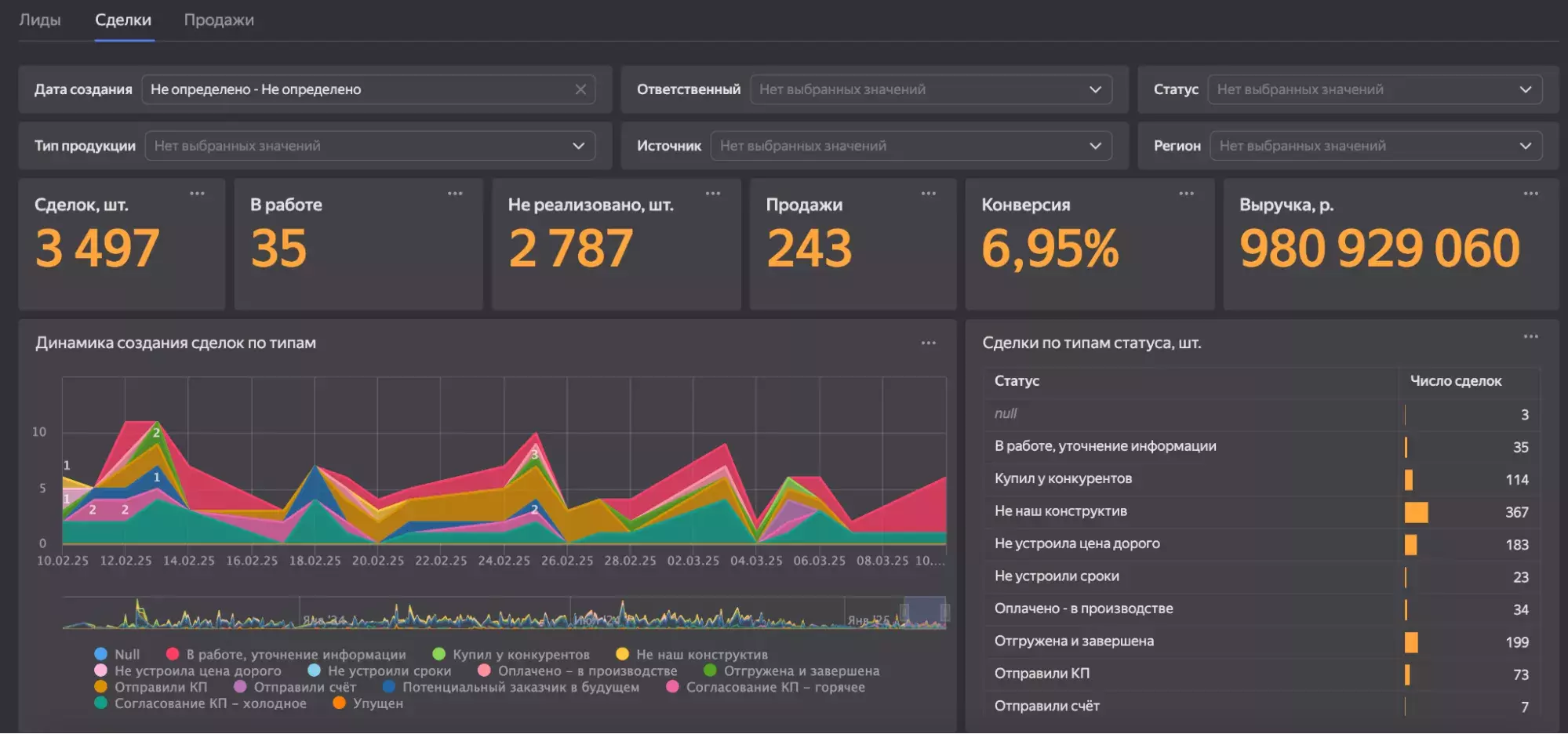 Еще один инструмент — Yandex DataLens, который позволяет анализировать информацию о продажах, клиентах, сделках и других аспектах бизнеса, используя мощные инструменты визуализации и анализа данных. В результате компания может получить более глубокое понимание бизнес-процессов, улучшить качество принятия решений и повысить эффективность работы.