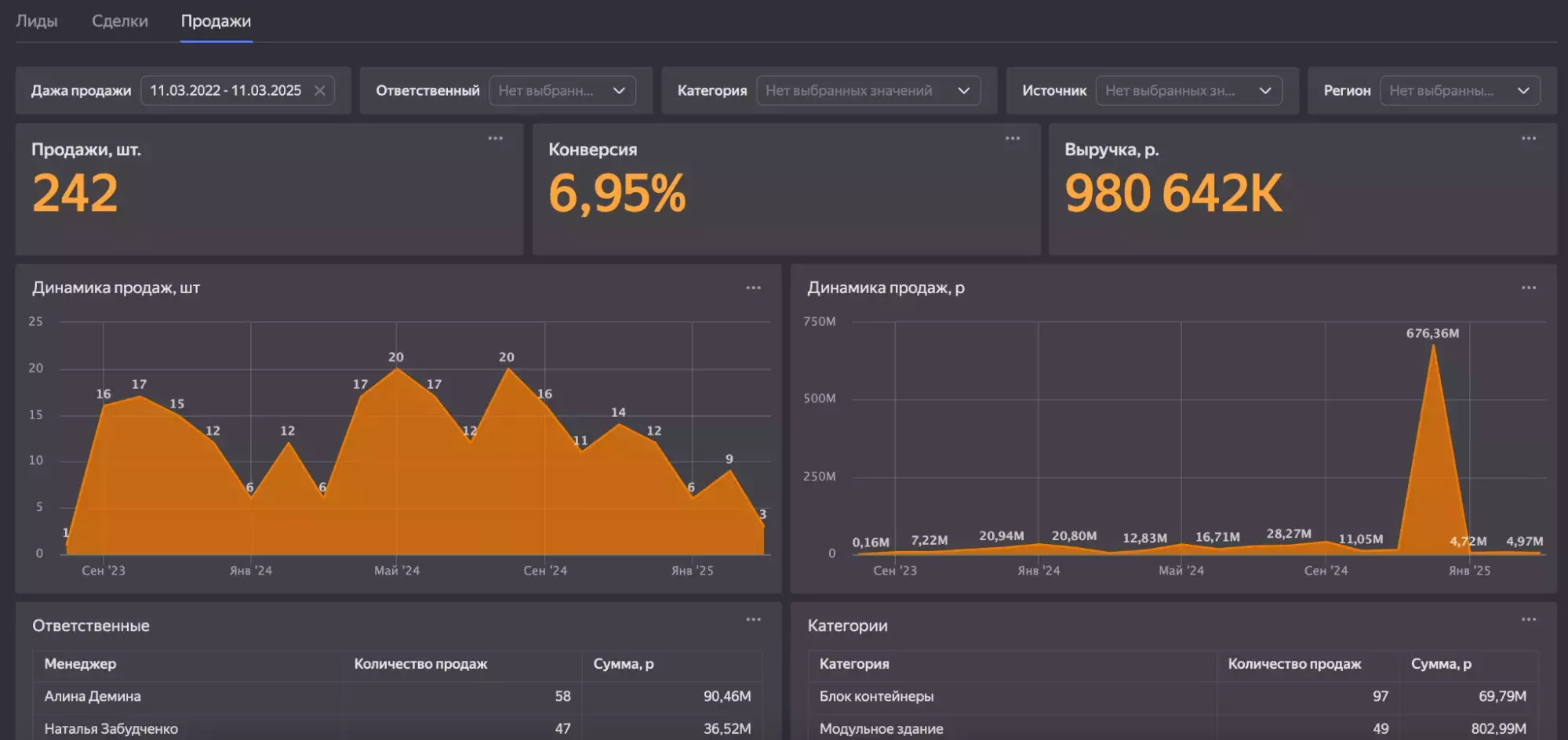 В первую очередь, необходимо получить полную картину о всех лидах и продажах, нагрузке на каждого менеджера, выручке и т.д. Собрать все данные решили при помощи внедрения системы BI-аналитики на базе интеграции Bitrix24 с Yandex DataLens. Это позволяет автоматизировать сбор и анализ данных, предоставляя наглядные отчёты и дашборды для мониторинга KPI и выявления тенденций.