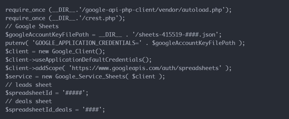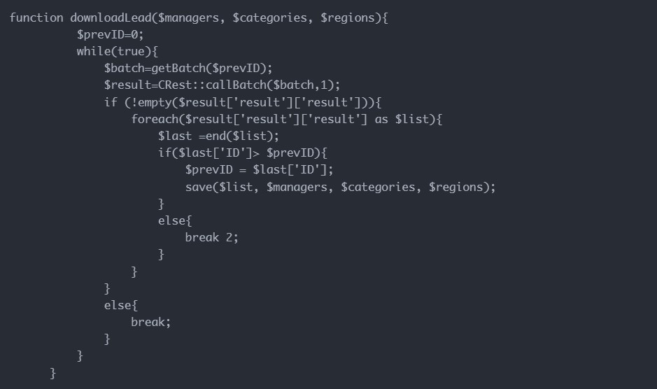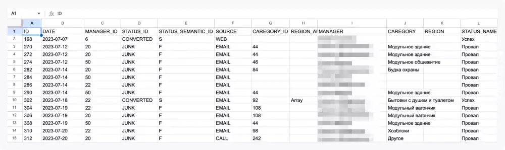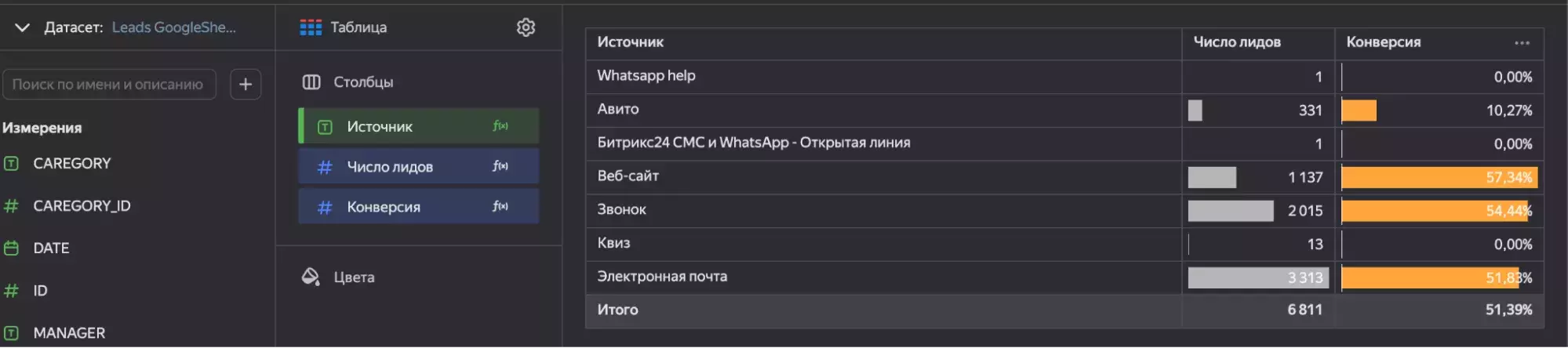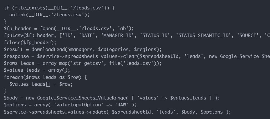 Получили данные по лидам и сделкам из Bitrix24 и обработали их в системе BI-аналитики Yandex Datalens. Пример полученного дашборда с визуализацией всей информации: Благодаря таким отчетам появляется возможность максимально быстро проанализировать информацию в режиме онлайн или применить фильтры по категориям, менеджерам, источникам и т.д. Задача поставлена, аналитика проведена, инструменты выбраны. А теперь разработчик Зекслер делится тем, как происходила реализация внедрения дашборда с технической стороны. Для выборки данных изначально определили, какая информация из Bitrix24 будет использоваться для анализа в Yandex DataLens (например, инфо о сделках, лидах, продажах и т. д.). Настроили процесс загрузки данных из Bitrix24 в Yandex DataLens. В нашем случае выгрузка происходит в CSV-файл и в Googlе-таблицы. Из Google-таблиц данные забираются через встроенное в DataLens подключение к источнику данных. Информация в таблицах и CSV-файлах автоматически актуализируется раз в сутки. Периодичность обновления данных может быть любым. Для подключения к REST API, было создано локальное приложение, которое хранится у нас на сервере. Для работы с Google таблицами на сервере, в папке с приложением установили PHP-библиотеку. Сами таблицы первоначально создаются через веб-интерфейс. Далее создается сервисный аккаунт Google. Этот аккаунт (e-mail) привязывается к созданной таблице с правами редактирования: На стороне приложения подключаемся к Google Sheets: Используя API Bitrix24 получаем информацию по лидам и сделкам. Ввиду того, что лидов и сделок много, код был оптимизирован для пакетной обработки данных (в нашем случае по 50 элементов за раз): Пример кода получения и сохранения лидов в файл и последующую отправку в Google таблицы: Полученная таблица с данными: Следующим этапом была обработка данных в Yandex DataLens. Создали дашборды на основе анализа данных, чтобы отслеживать ключевые показатели эффективности (KPI) и принимать обоснованные решения. Такая сборка данных в удобном и актуальном дашборде позволяет в любой момент руководителю, РОПу или другому заинтересованному лицу увидеть статистику всей работы, продаж, нагрузки на менеджеров и эффективность менеджеров. Не нужно для этого делать дополнительные отчёты через битрикс и прочие сервисы, всё индивидуально настроено в дашборде с понятными графиками и фильтрами. Чарты в данный момент постоянно дорабатываются. Проверяем гипотезы, учитываем пожелания клиента.