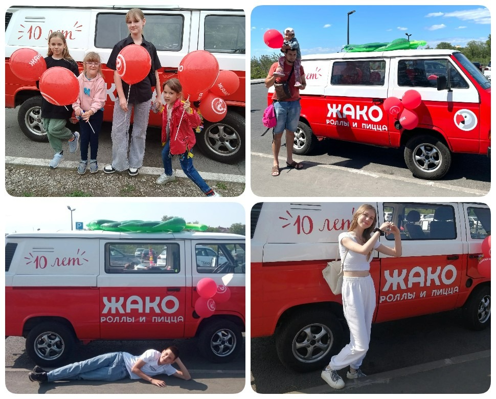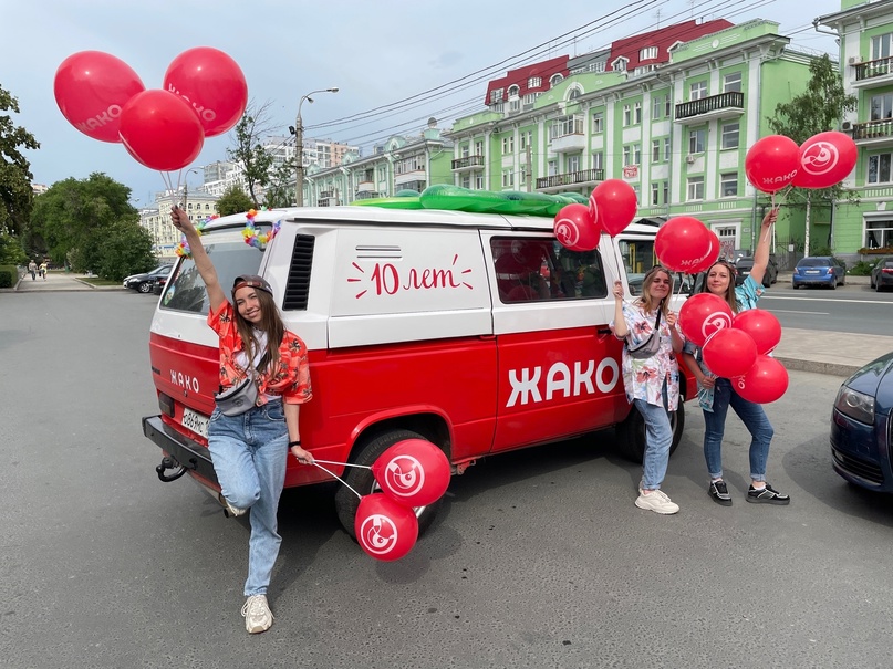 В честь юбилея мы отправили в турне по Самаре и Тольятти настоящий Жакобус! Дружная команда «Жако» путешествует по улицам городов в брендированном микроавтобусе и дарит жителям отличное настроение, улыбки, яркие воздушные шары и угощение!