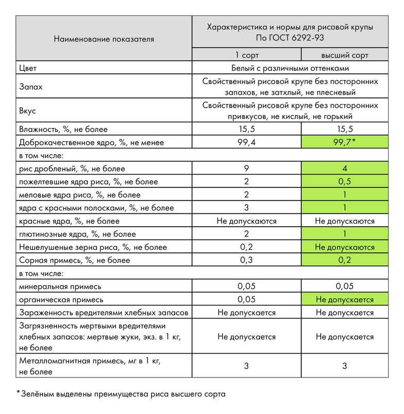 В результате тестирования крупы разных производителей мы выбрали кубанский рис высшего сорта ГОСТ 6292-93. По сравнению с первым сортом в нём: