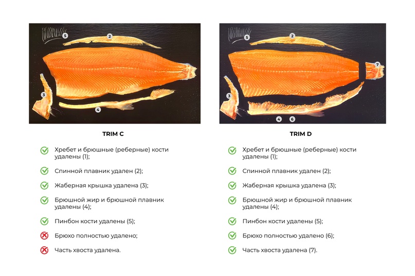 Производители лосося поставляют на рынок пять вариантов разделанного лосося: Трим А, Трим B, Трим С, Трим D, Трим Е. Дословно Трим (trim) переводится с английского как «обрезка». Если у рыбы с разделкой Трим А удалены только позвоночник и рёбра, то рыба Трим Е — полностью очищена и готова к применению. Разделки Трим D и Трим E считаются премиальными.
