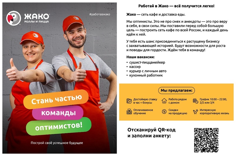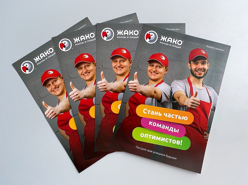 Также мы выбрали формат листовки и продумали каналы её распространения. Уже через несколько недель мы планируем официальное открытие нового кафе в Самаре. Но уже в ближайшее время у нас будет техническое открытие с работой в формате доставки. Мы временно привлечём опытных сотрудников, а затем постепенно будем комплектовать команду новичками. В связи с этим приглашаем на работу: — сушистов-пиццамейкеров, Если вы хотите строить своё успешное будущее вместе с нашей компанией, приглашаем прочитать подробности о работе в кафе и заполнить анкету. Мы с вами свяжемся. В будущем наш HR-отдел планирует создать отдельные листовки для поваров, кассиров, курьеров и кухонных работников. Там мы сможем более подробно рассказать об условиях работы для каждой должности. До новых встреч!