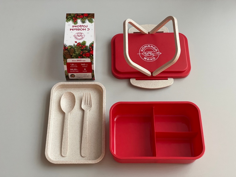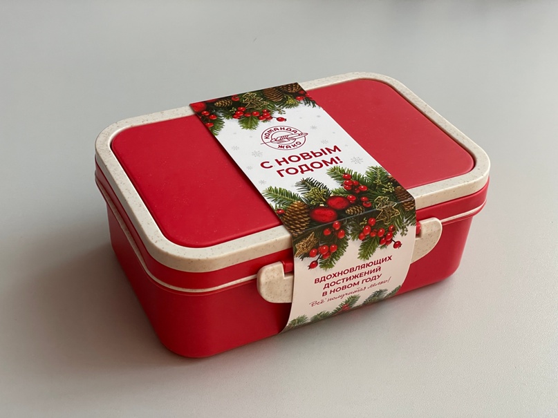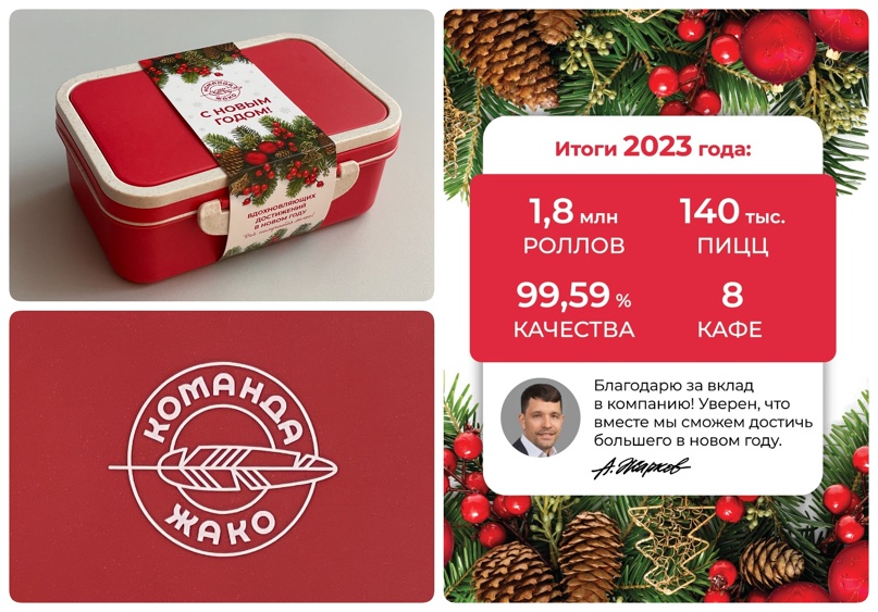 Уверены, что этот подарок точно пригодится каждому, ведь кроме работы его удобно брать в дорогу, в поход, на дачу, на пикник. Контейнеры мы выбрали фирменного цвета и сделали нанесение логотипа «Команда Жако» на крышку бокса. Бумажную упаковочную манжету оформили в новогоднем стиле, разместили на ней короткое ёмкое поздравление и основные показатели компании за 2023 год. Мы хотим, чтобы наши сотрудники гордились своей компанией. Для этого мы создаём достойные условия труда, проводим интересные праздники, радуем классными подарками. Присоединяйтесь и вы к Команде Жако! Хочу работать в кафе Надеюсь, каждого из вас ждут вдохновляющие достижения в 2024 году. До встречи через неделю!