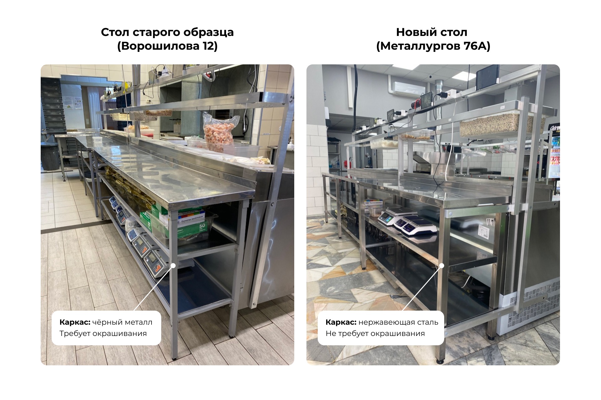 Мы перешли на новые производственные столы, и сейчас ими уже оборудована кухня кафе на Металлургов 76А в Самаре. Это позволило решить две важные задачи.