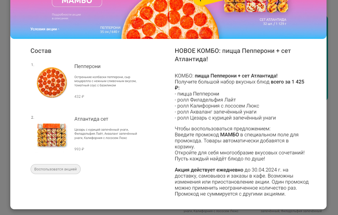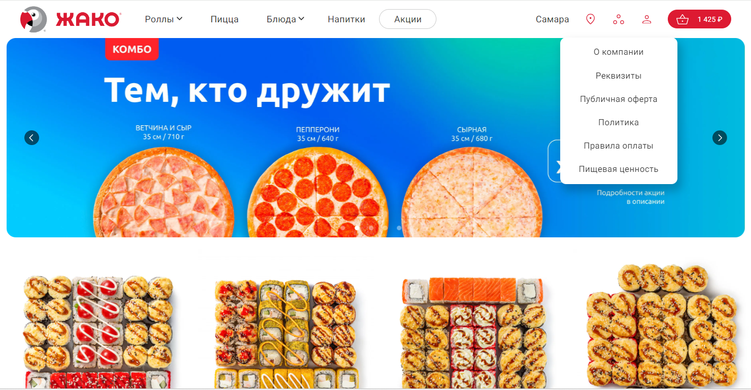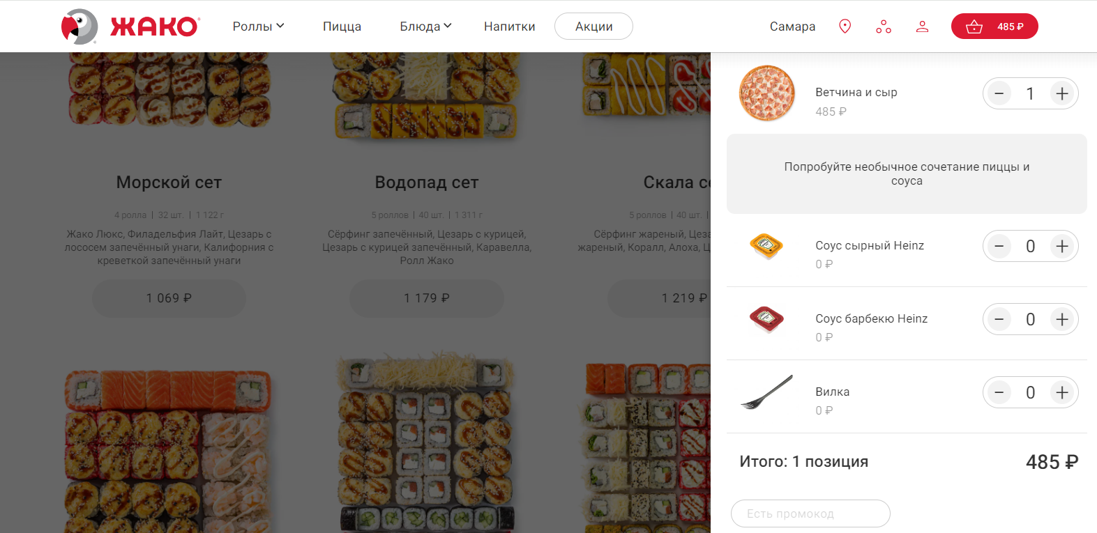 Поиск блюд — легче. Мы сократили количество пунктов меню, оставив самые важные: роллы, пицца, блюда, напитки, акции. В разделы «Роллы» и «Блюда» мы добавили выпадающие списки, благодаря которым можно быстро перейти в нужный раздел меню. Промокоды и акции — ближе. Раньше, чтобы прочитать условия акции и применить промокод, нужно было посетить отдельную страницу «Акции», затем вернуться обратно к блюдам. Теперь вся информация представлена на главной странице. Достаточно выбрать интересующее предложение, нажать кнопку «Воспользоваться акцией», и промокод активируется. После чего можно продолжить выбор блюд на той же странице. Корзина — информативнее. При выборе блюд на кнопке «Корзина» отображается сумма заказа, а при нажатии на кнопку открывается окно, в котором сразу можно добавить приборы и соусы. Адреса доставки — точнее. Теперь при оформлении заказа можно сохранить несколько адресов и дать им название, например: «Дом», «Офис», «Спортзал». Кроме того, теперь при вводе адреса доставки сразу видна точка на карте. Адреса в разных районах и посёлках могут повторяться, но карта позволит перепроверить правильность выбора. Также можно сделать один из адресов главным, он будет всегда наверху списка. Информация и документы — доступнее. Всю информацию о компании и документы для клиентов объединили в одно меню, их же продублировали в привычном месте — футере сайта. Мы достигли этих результатов с помощью использования новых технологий, замены архитектуры сайта и разработки нового дизайна. У нас ещё много интересных задумок, которые мы постепенно будем воплощать на новом сайте. Например: — добавить фильтр по ингредиентам, чтобы ускорить поиск блюд; Технологии не стоят на месте, поэтому не исключено, что мы будем добавлять и другой функционал, «докручивать» и улучшать сайт с присущей нам тщательностью. Если вы уже воспользовались новым сайтом, просим рассказать о своих впечатлениях в комментариях. Спасибо, что остаётесь с нами! До встречи в следующий вторник! Приглашаем в наш Телеграм канал