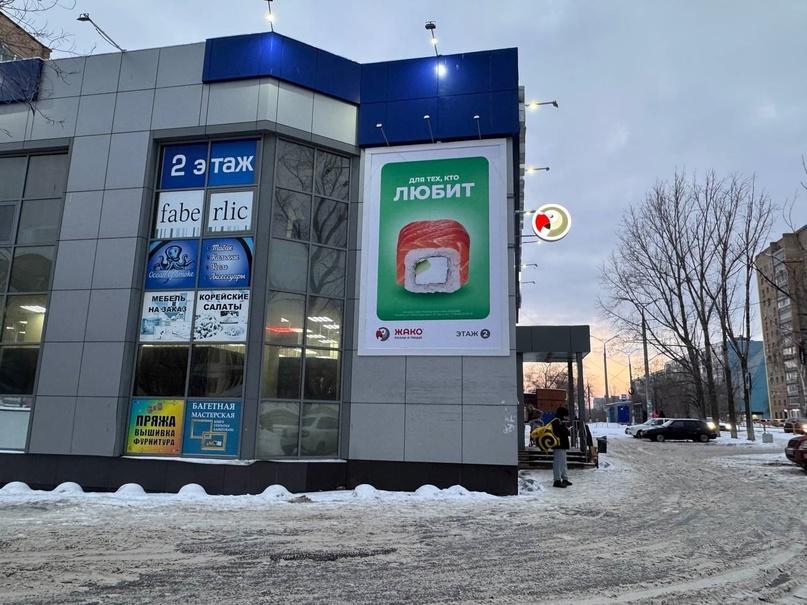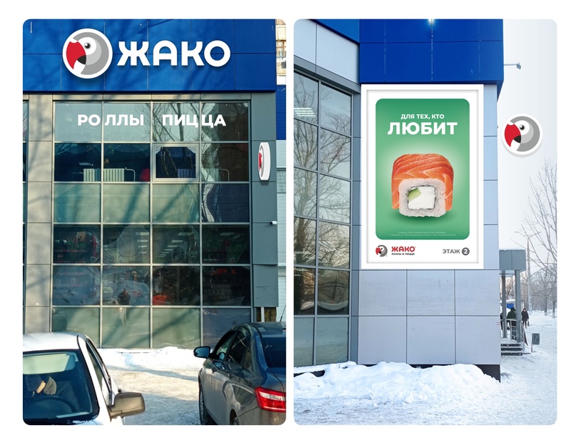 Только после этого мы приступили к разработке проекта. Мы провели анализ собранной информации и определили состав коммуникационной системы: Эта коммуникационная система охватывает автомобильный и пешеходный трафик со стороны двух улиц. Вывеска и дескриптор располагаются непосредственно над окнами и в окнах кафе, чтобы посетители легко поняли, в какой части здания мы находимся. Мы развиваем бизнес по франшизе, поэтому заранее разработали концепцию оформления торговой точки бренда «Жако». Она универсальна и адаптивна, то есть в каждом следующем кафе «Жако» вывеска будет соответствовать стилю сети, но учтёт его локальные особенности. После первой серии макетов мы выбрали наиболее функциональный и готовы были его реализовать, но пришлось поменять планы. Возникли внешние обстоятельства, которые повлияли на расположение коммуникаций. Мы возобновили работу. В общей сложности мы разработали более 20 вариантов дизайна коммуникационной группы и выбрали самый эффективный. Изготовление и монтаж системы мы доверили проверенному подрядчику, который делал для нас вывеску в кафе на Ленинградской 47. Все конструкции отличаются повышенной прочностью, а материалы — износостойкостью. Например, световые буквы вывески «Жако» и «роллы пицца» крепятся на надёжной стальной раме, а лицевая часть букв изготовлена из белого литого акрила, устойчивого к УФ-лучам. Рекламный баннер имеет прочный каркас из стальной рамы, при этом полотно с информацией можно менять. А торцевые указатели спроектированы таким образом, чтобы между элементами конструкции не накапливались пыль и влага. Вся навигационно-имиджевая система была установлена за один день, а на другой день её подключили к электрической сети. Вывески светятся круглосуточно, но в тёмное время суток это особенно заметно: их видно издалека. Особенно это важно сейчас, в зимнее время, когда начинает темнеть задолго до закрытия кафе. Теперь благодаря яркой вывеске прохожие и проезжие сразу обнаружат наше кафе и поймут, что здесь можно заказать роллы и пиццу. Они легко определят, в какой части здания мы находимся и быстро нас найдут. Надеемся, что многие откроют для себя наши блюда впервые. Приглашаю всех в гости в кафе на Матросова 32, и до новых встреч в блоге компании «Жако»! Всего доброго!