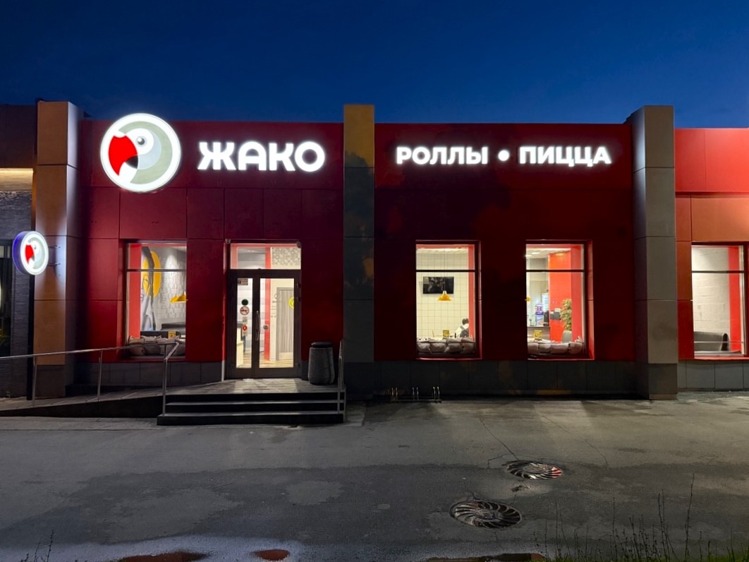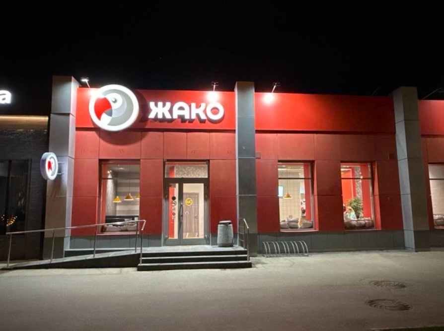 После проведённой работы вывеска стала более заметной и информативной. Пешеходам и автомобилистам сразу понятно, что в «Жако» можно утолить голод. И особенно это важно для клиентов, которые пока не знакомы с нашей сетью кафе.
