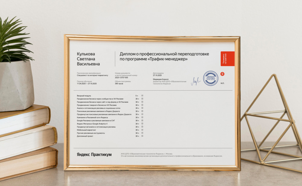 Благодаря курсу я научилась настраивать рекламные кампании и анализировать их эффективность. Предложила новые идеи для наших проектов, часть из которых мы с коллегами уже реализуем в работе.