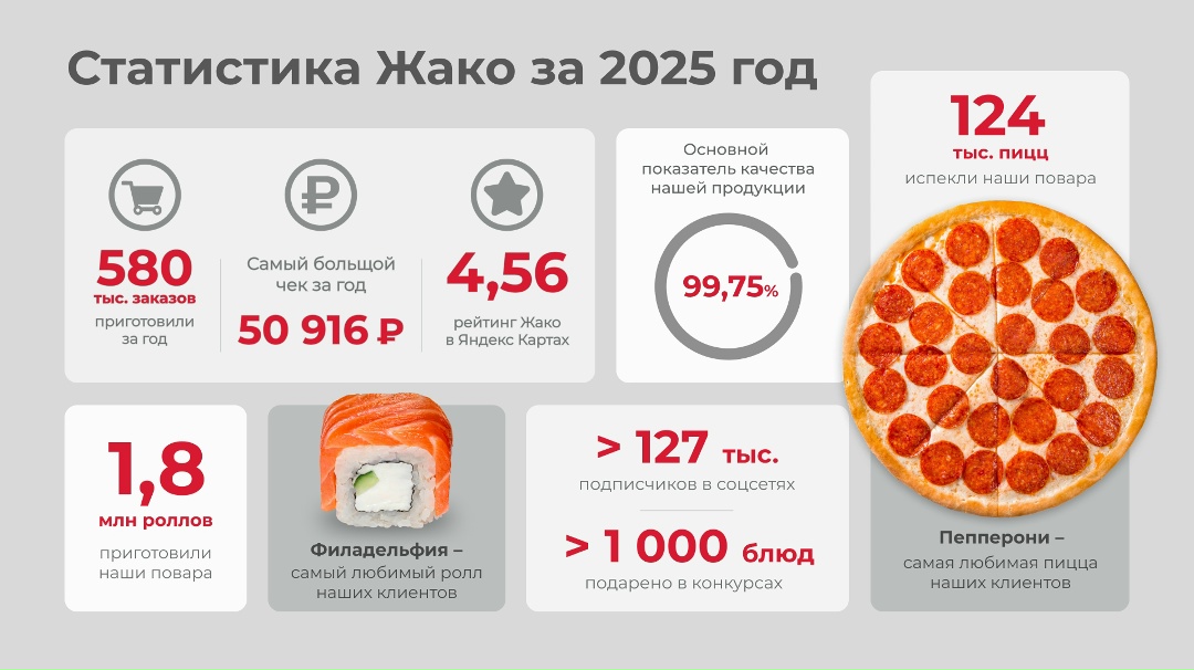 И, конечно, мы продолжали вдохновлять наших клиентов. В социальных сетях весь год рассказывали о фильмах и книгах, которые мотивируют на достижение целей, оптимизм и доброту. А в конце года повторили пряничную традицию «Мои имбирные мечты». Вторая важная задача года — усиление команды. Мы разработали ценностное предложение, чтобы соискатели могли ознакомиться с преимуществами работы в компании. А также большое внимание уделили подбору, обучению и развитию команды. К концу года мы почти полностью закрыли потребность кафе в сотрудниках, а также пополнили офисный штат. Наши сотрудники проходили обучение и посещали профильные выставки за счёт компании. Чтобы мотивировать коллег, мы поддерживали инициативу, награждали отличившихся, готовили новогодние подарки. Для укрепления командного духа и получения новых знаний проводили корпоративные активности — ловлю форели и карпа, экскурсию на производство дронов. Даже небольшие сезонные радости вроде «арбузного» и «мандаринового» настроения работали на атмосферу и вовлечённость. Изменения коснулись и рабочих пространств: в нескольких кафе обновили кухни, сделали их удобнее и безопаснее. Для бизнеса 2025 год начался с того, что мы определили стратегию, цели и задачи на год, а в течение года старались придерживаться плана. Важным для нас событием стало открытие нового офиса в Самаре. Это было необходимо самарской команде, чтобы принимать независимые решения по локальным вопросам и работать более эффективно. Решили, что при расширении сети кафе у каждого партнёра-франчайзи будет собственный офис. Мы внимательно следили за изменениями в законодательстве и соблюдали их. В начале года перешли на новый режим налогообложения и разработали рекомендации по налогообложению для франчайзи. В течение года полностью отказались от использования иностранных серверов для хранения персональных данных и перешли на новый порядок расчёта в кафе. Также в этом году мы сделали бизнес более прозрачным и прогнозируемым благодаря расширению модуля аналитики информационной системы «Жако Шеф». В программировании, маркетинге и других сферах деятельности нам помогал искусственный интеллект. Важной задачей для нас стало создание проекта «Умное кафе». Пока мы разработали концепцию и начали тестировать систему в одной точке — на Ленинградской 47 в Тольятти. Но следующие кафе планируем открывать уже с учётом новых наработок. Также в этом году мы посетили крупнейшую выставку франшиз BuyBrand и изучили актуальное состояние сферы франчайзинга в РФ. Уважаемые клиенты, коллеги и партнёры, поздравляю вас с наступающим 2026 годом! Желаю вам неиссякаемого оптимизма и благополучия во всех сферах жизни. Пусть следующий год радует вас успехами. Вместе у нас всё получится! С наилучшими пожеланиями, Андрей Жарков