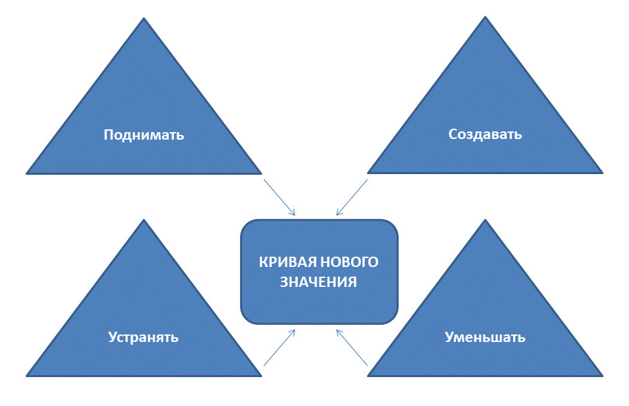 Чтобы построить канву для поиска голубого океана, сначала необходимо воспользоваться инструментом «модель четырех ценностей».