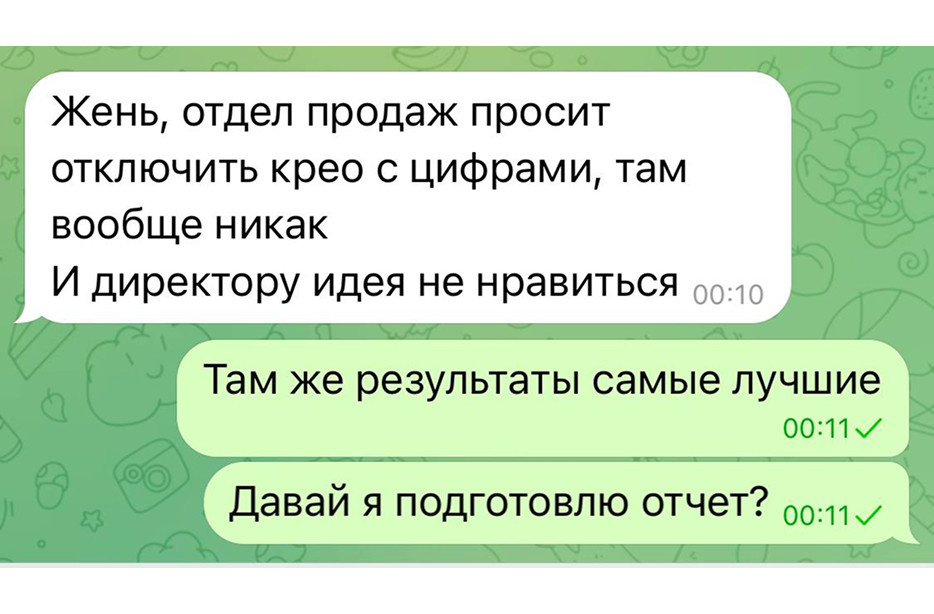 Директору не понравились те объявления, которые он видит в Яндекс Директ сейчас. Мол креативы должны быть завлекающими, интересными, кликабельными, а у вас, Евгений, одни какие то скучнейшие серые цифры. Надо, чтоб было как у всех! А с этих кампаний еще и цена лида в два раза дороже, срочно отключайте!
