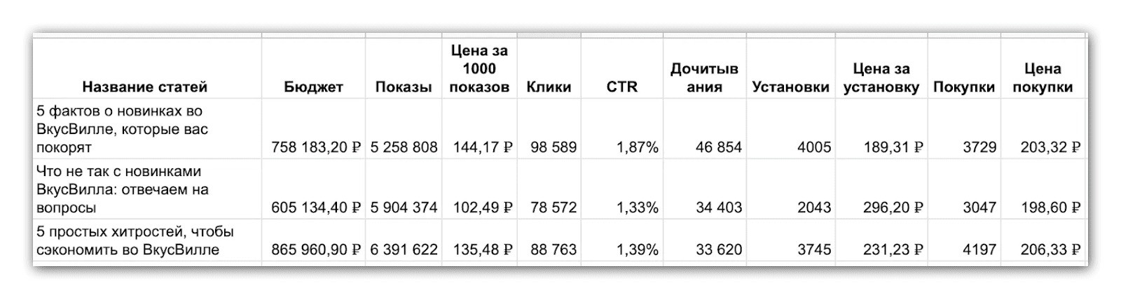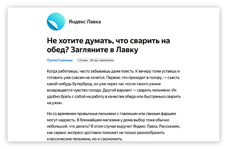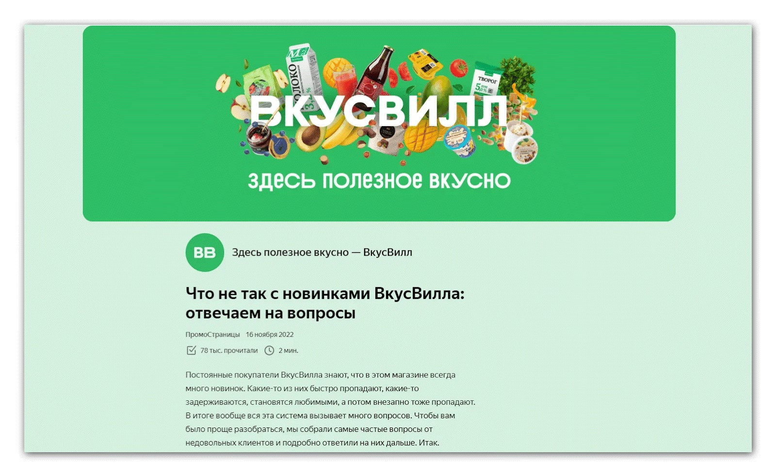 Большой плюс ПромоСтраниц — можно привлекать и прогретую, и холодную аудиторию. Мы для этого используем Лестницу Ханта: готовим контент под пользователей с разным уровнем знаний о продукте. Примеры статей по ступеням: Первая ступень: вообще не задумываются о проблеме. → Мне 25 и я перестал покупать еду в магазинах Вторая ступень: знают о проблеме, не знают о решениях. → Как выпутаться из растущего долга по кредитке? Третья ступень: знают о решениях, не знают о продукте. → Сравниваем линолеум и кварц-виниловые полы Четвёртая ступень: знают о продукте, выбирают, у кого купить. → Smart TV — чем отличаются и какой телевизор выбрать О том, как писать тексты на ПромоСтраницы для разных аудиторий, мы подробно рассказали в отдельной статье — «Как написать статью для ПромоСтраниц, которая принесёт много заявок». ВкусВилл получил клики по 8.3₽ в рекламе статей. Компания запустила в рекламу несколько статей, которые рассказывали о качестве продуктов, показывали лайфхаки. Команда сделала их в своём стиле: старались рассказать добродушно и просто, с заботой о читателе.