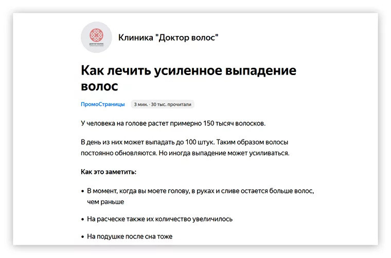 ПромоСтраницы мы выделили отдельно по двум причинам: Как работают ПромоСтраницы: 1. Вы пишете статью о своём бизнесе. Ориентировать её можно на любой этап воронки: создать спрос, рассказать о решении или раскрыть преимущества компании. 2. Готовите несколько заголовков и обложек. Мы обычно подбираем к статьям 5 и 3 соответственно. После запуска рекламы система сделает из них 15 комбинаций. 3. Задаёте основные таргетинги: пол, возраст и географию. Запускаете рекламу, а дальше сервис сам её оптимизирует под пользовательские интересы. 4. Пользователь видит публикацию в Рекламной сети Яндекса, переходит в статью. Когда он дочитывает материал, следующая прокрутка колёсика мыши автоматически переведёт его на сайт компании. Более детально в нашем обзоре: «Как работает реклама в Яндекс ПромоСтраницах: примеры рекламных кампаний и рекомендации по статьям»