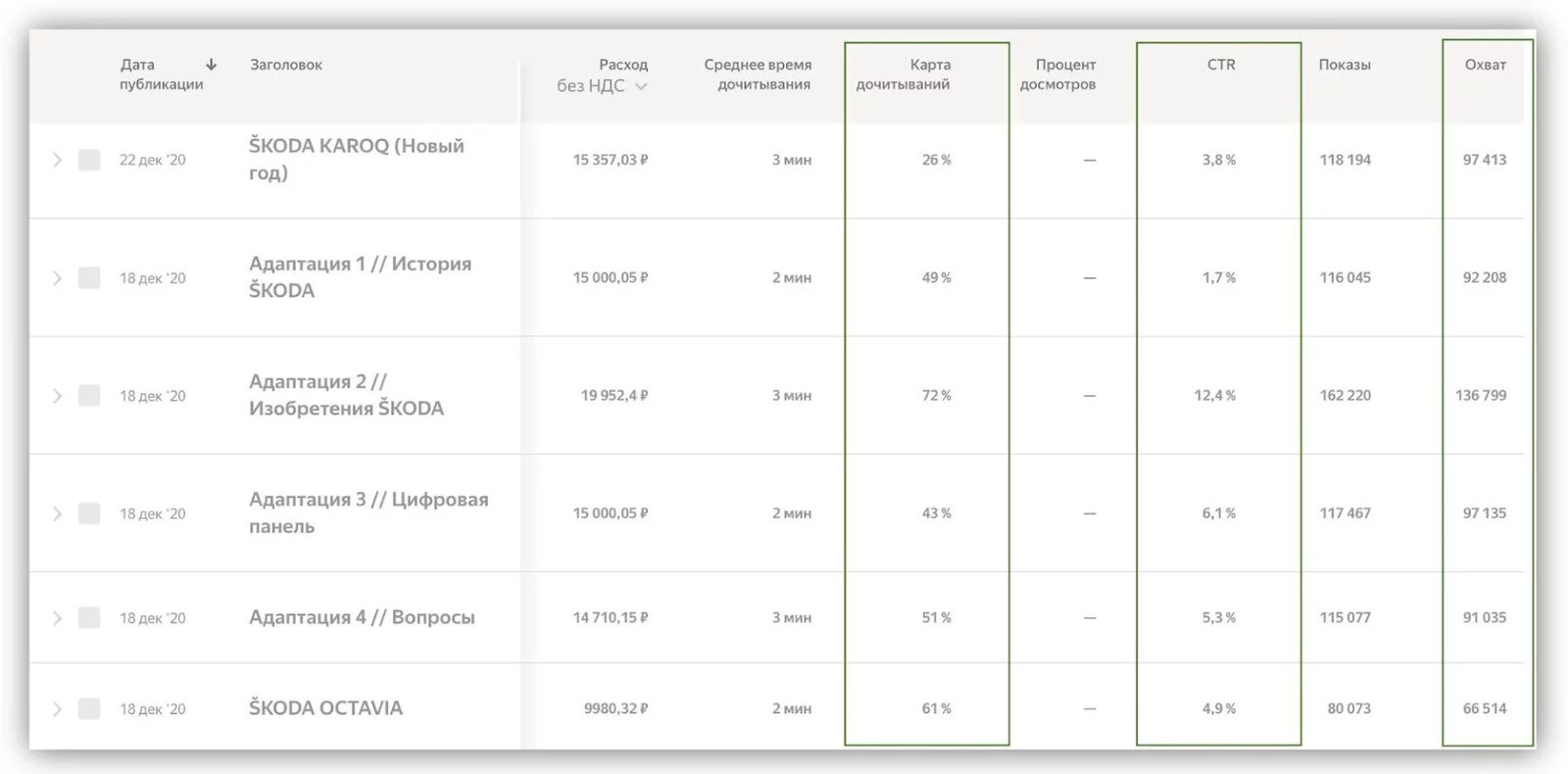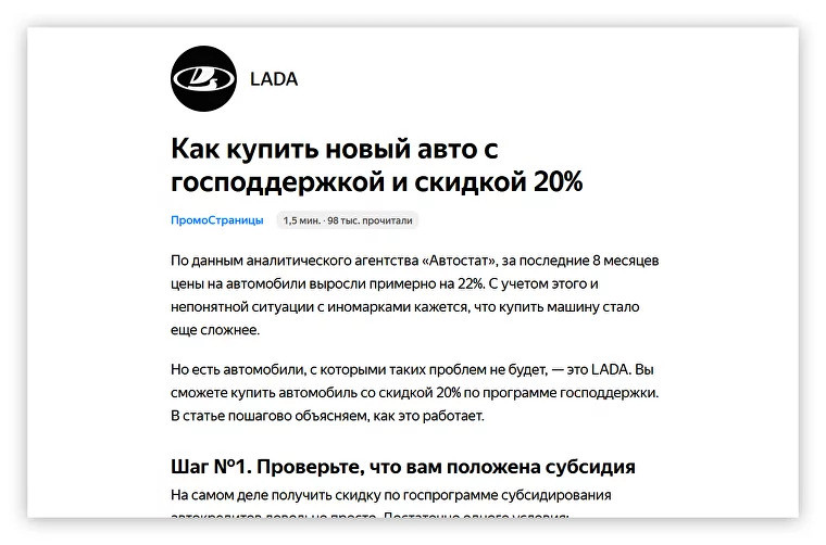 Изначально кампания в ПромоСтраницах планировалась для PR-задач: рассказывать о компании, вовлекать аудиторию, повышать лояльность. На деле рекламные статьи принесли ещё и продажи. Из тех данных, которыми поделилась команда ВкусВилл, видно, что стоимость клика составила 8.3₽, стоимость установки приложения — 227,6₽. → Кейс целиком на канале Промостраниц в Дзене Застройщик прорекламировал таунхаусы за 300 млн. К нам обратился застройщик, чтобы привлечь новых клиентов для покупки недвижимости в элитном ЖК. Мы подготовили три статьи с разным подходом и запустили в рекламу. За всю кампанию мы собрали около 20 тысяч просмотров, 10 тысяч дочитываний и 2 тысячи переходов на сайт. Цена перехода на сайт из некоторых статей была ниже 35₽ — это хороший результат в нише элитной недвижимости. ŠKODA провели рекламную кампанию на охват. Команда, которая занимается пиаром бренда, решила протестировать Дзен для продвижения. Агентство Ketchum, которое рекламирует бренд в России, обратилось к нам за статьями и настройкой рекламы.