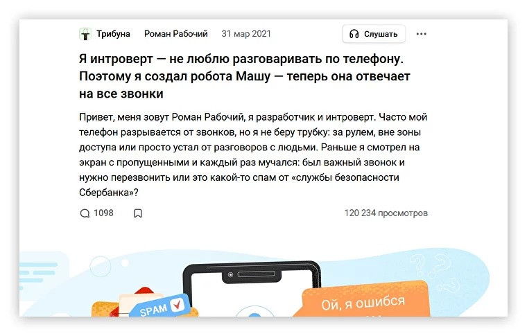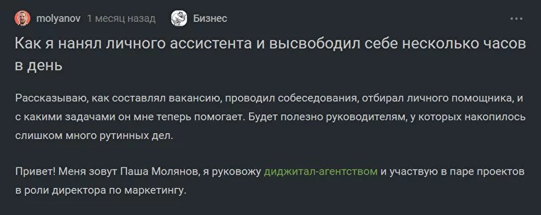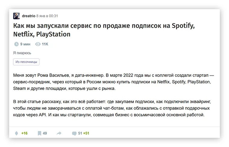 В России сложились несколько площадок для брендформанса. Это платформы, которые многие годы сочетали развлекательный контент с полезными статьями для бизнеса и профессиональной экспертизой. В этом суть брендформанса: гибридный формат, который раскрывает продукт через интересный для аудитории контент. Какие площадки можно использовать: Vc.ru. На площадке хорошо заходит бизнесовый контент. Можно рассказать об управлении, маркетинге или праве, поделиться своим опытом запуска бизнеса или показать кейс. Важно раскрыть тему подробно и интересно: в первую очередь думать о пользе читателя, а не рекламе продукта. У нас есть об этом подробная статья: «Как написать статью о своем бизнесе на vc.ru и не опозориться. Гайд от выбора темы до срача в комментариях» Habr. Узкопрофильная площадка с IT-контентом. На ней хорошо продвигаются технологичные стартапы, продукты для менеджмента и разработки. Аудитория Хабра специфическая, поэтому статьи стоит очень детально прорабатывать — читатели-программисты легко выявят неточности в публикации и обязательно на них укажут. Pikabu. Развлекательная площадка, на которой публикуют мемы, личный опыт и посты с рассуждениями. Подойдёт для продвижения несложных продуктов, чтобы контент не показался душным. Рекламировать товары и услуги стоит аккуратно — аудитория очень болезненно относится к упоминаниям бизнеса.