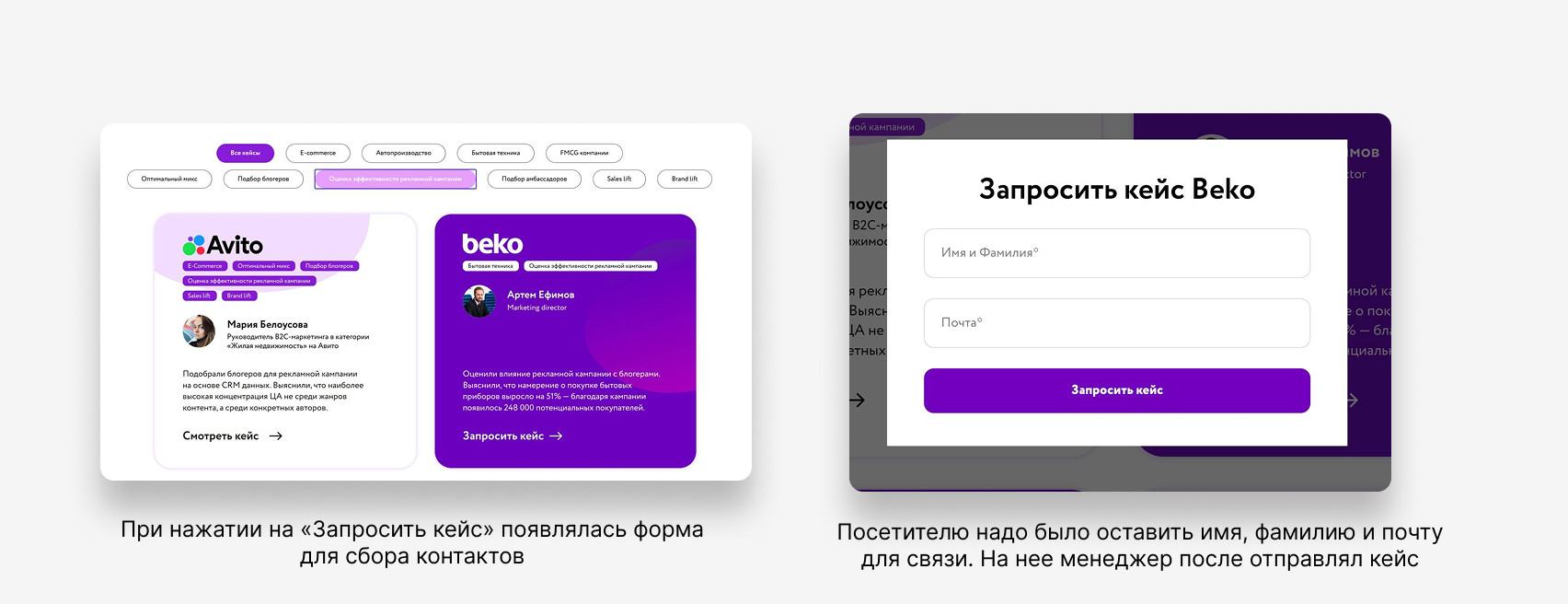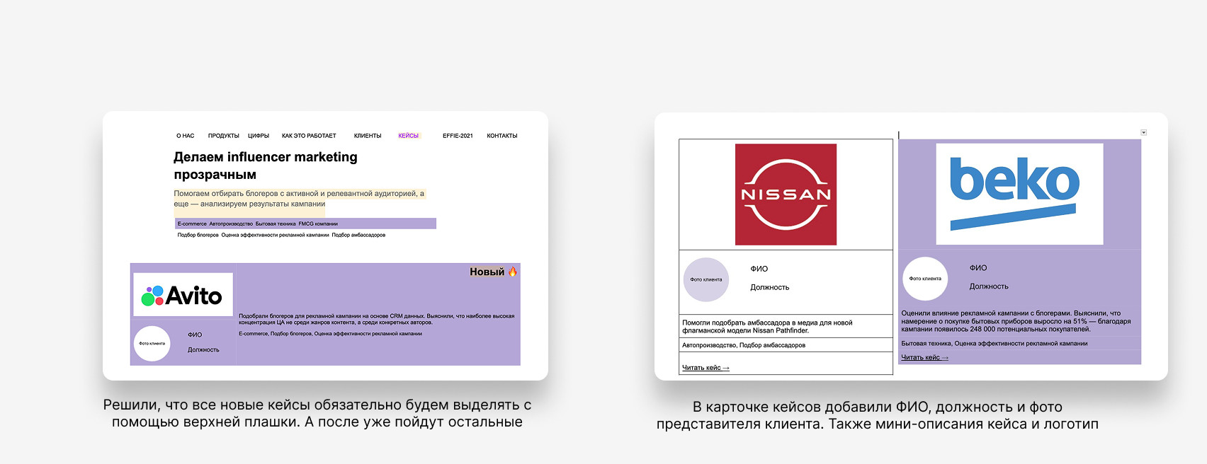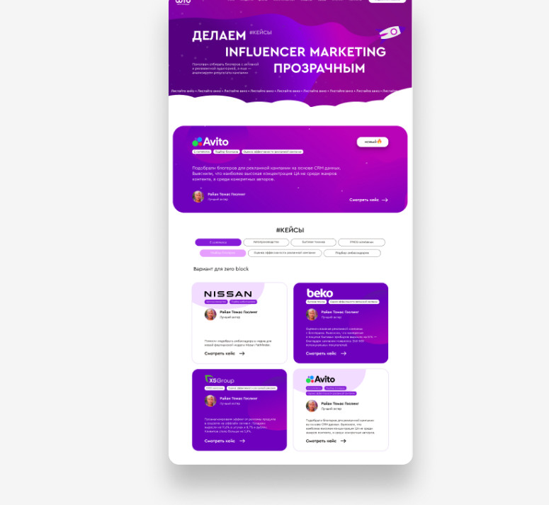 Общая логика следующая: посетитель попадает в раздел с кейсами, листает и первым делом видит большой баннер с новым кейсом. Дальше можно с помощью фильтров выбрать интересующий продукт WhoIsBlogger и сферу.