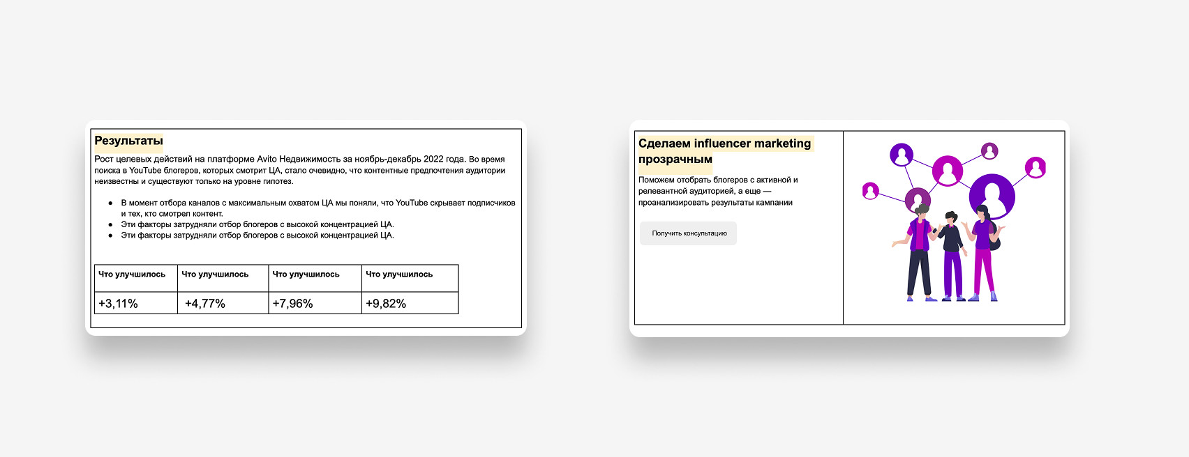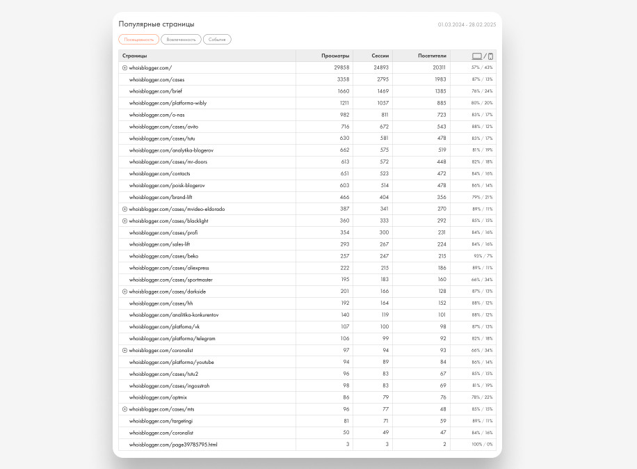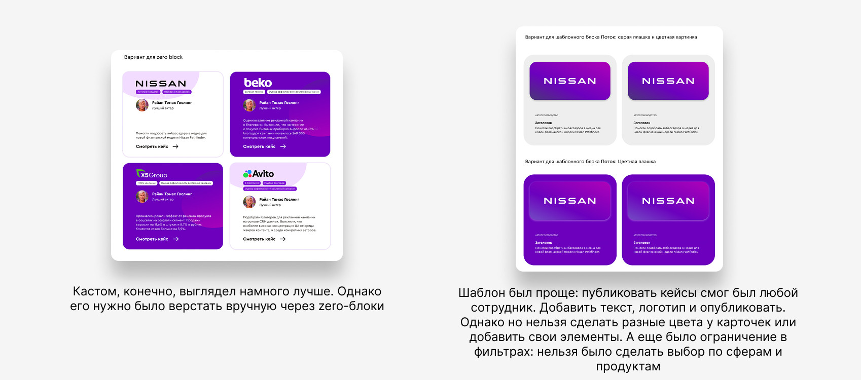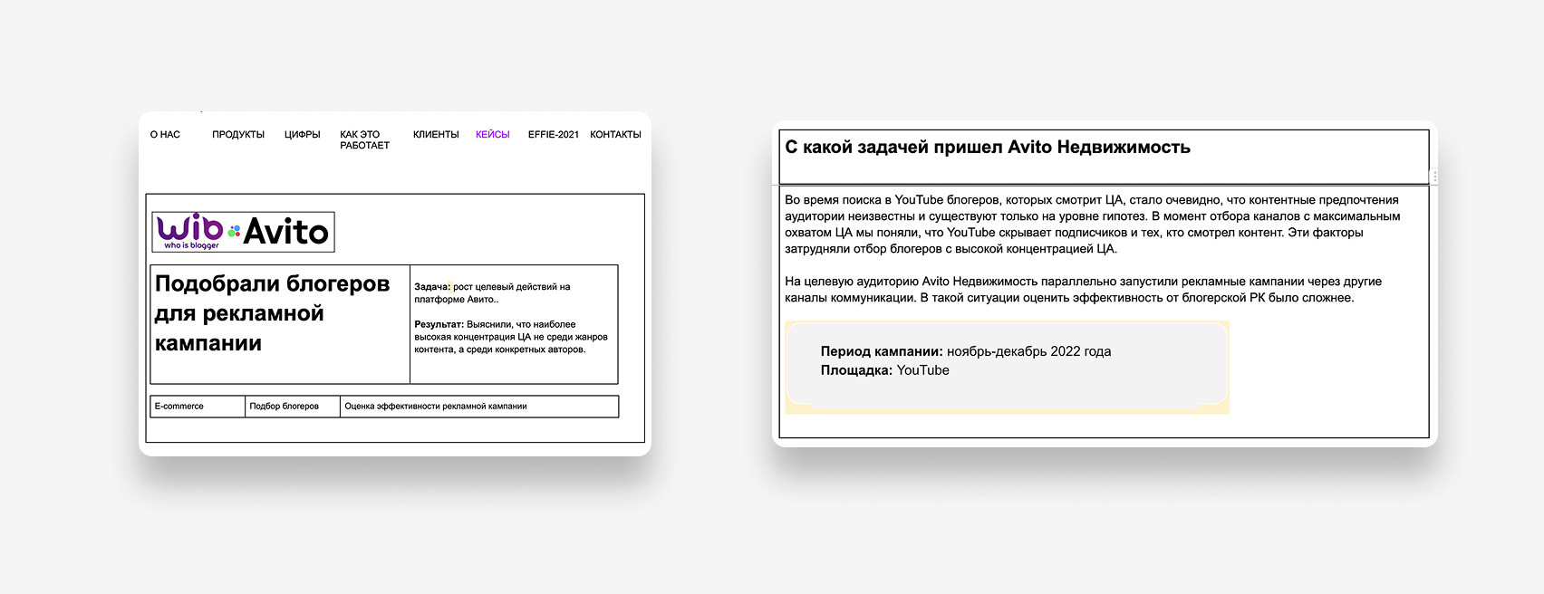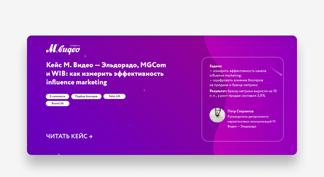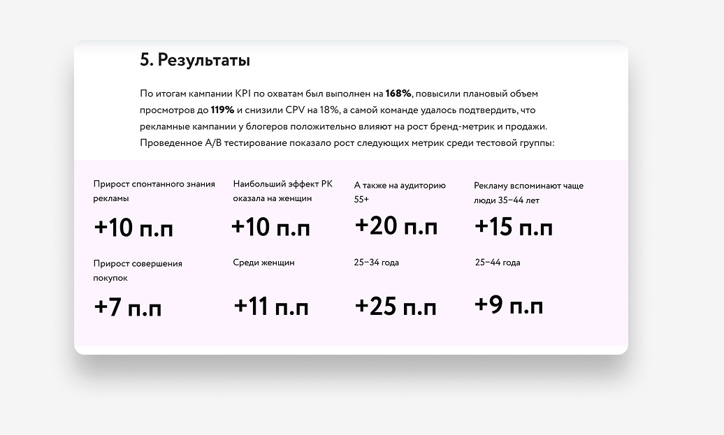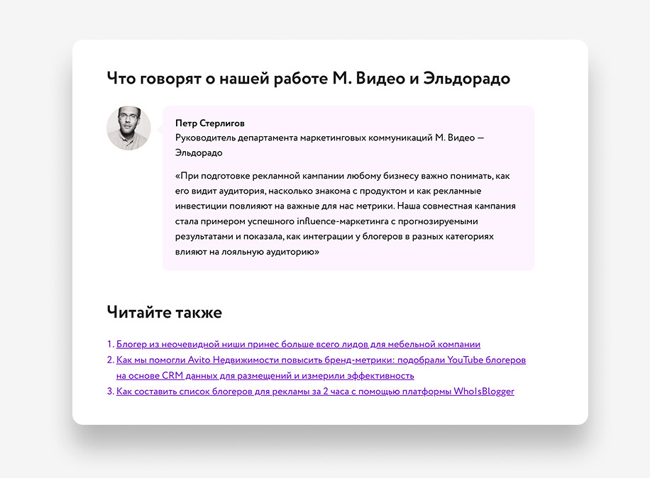 Параллельно проработали шаблон для будущих кейсов: В будущем авторы просто брали за основу этот шаблон и заполняли его по фактуре с презентации или встречи с клиентом. Так мы смогли сэкономить время на работу и быстрей приносить готовые тексты. После утверждения прототипа мы разработали два варианта дизайна: шаблонный и кастомный. В результате клиент выбрал кастомный вариант. На следующем этапе: Когда утвердили дизайн страницы, собрали ее на «Тильде» и подключил систему фильтрации. Во время верстки добавили карточки кейсов с кнопкой «Запросить кейс», которые переводят на форму сбора контактов. После менеджер уже связывается с потенциальным клиентом и высылает презентацию по кейсу. Так у нас получилось сделать страницу более наполненной на старте и сделать дополнительный лид-магнит. UPD: сейчас временно убрали такие карточки, так как кейсов стало намного больше и Тильда не пропускает столько контента. Мы выстроили четкий процесс написания: UPD: Позже процесс упростили: начали брать материалы из клиентских презентаций, чтобы сократить время согласования. Верстали кейсы по изначальному шаблону. На заднем фото главного экрана поставили анимацию с «плавающим» облаком. В среднем кейсы дочитывают до конца 34,07% пользователей. Для длинных текстов это хороший показатель — значит, аудитория действительно вовлекается в материалы. Лучший результат показал кейс «М.Видео-Эльдорадо» — 38% ER. Это говорит о том, что тема была интересна, а подача удержала внимание читателей. Остальные кейсы стабильно набирают 28-31% ER (уровень вовлеченности). Люди не просто заходят на страницу, а действительно читают и изучают контент. Больше аналитики можно увидеть на скриншоте ниже ↓ Для платформы VC.ru рерайтили кейсы: "Работа выстроена логично, с четкими этапами и оперативной коммуникацией. Финальный результат полностью соответствует ожиданиям, при этом команда была гибкой в случае необходимости правок на последнем этапе. Хотелось бы больше проактивности на этапе брифа — предложений по подаче кейсов, чтобы разнообразить формат. Также было бы полезно больше экспертных рекомендаций по тем подходам, которые, исходя из вашего опыта, дают наилучшие результаты. Отдельно хотелось бы отметить оформление: было бы здорово усилить визуальную подачу, особенно в части акцентов на конкретных результатах. Учитывая ваш опыт, ожидается чуть больше компетенций именно в этом аспекте. В целом, работа на высоком уровне!", — Лев Грунин, CEO WhoIsBlogger. Таня Артемова, главред Екатерина Малахова, редактор и проджект-менеджер Вова Муравьев, дизайнер Катя Косарева, корректор Анастасия Швец, автор