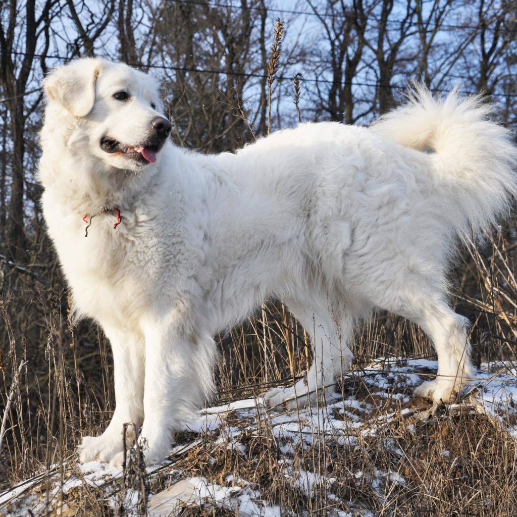 Окрас породы — белый, без любых других оттенков. Недопустимы желтоватые пятна на шерсти. Шерсть короткая на голове, спине и лапах. На шее шерсть образует гриву, так же длинная шерсть на хвосте. Цвет кожи розовый и черный в местах слизистых оболочек. Крупная голова с носом, составляющим ее половину, клиновидной формы. Нос — коричнево-черный, может меняться, на чисто черный, в зависимости от времен года. Мощные челюсти с ножницеобразным прикусом. Темные овальные глаза с черными веками. Уши высоко стоящие, висящие почти до нижней челюсти. Шея толстая, имеет такую же длину, как голова с мордой. Спина прямая, с широкой мускулистой поясницей. Живот и пах подтянутые, широкая грудная клетка. Угол плече-лопаточного соединения почти прямой. Передние лапы прямые с массивными запястьями. Мощные бедра широкие и продолговатые. Голени длинные и крепкие. Когти крепкие, серые. Движение породы — аллюр. Хвост по длине доходит до предплюсны, пушистый.