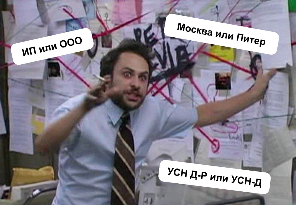 Шаг 2. Выбрали регион и юридический адрес. Фаундер не знал о пониженных ставках УСН в регионах и хотел открыть компанию в Москве. Сам он живёт в Москве и все Заказчики там же. Кроме того, кажется, что юридический адрес в столице — это всегда более солидно. При этом команда у ИП была полностью удаленная — сотрудники работали из разных регионов России, а некоторые за границей.