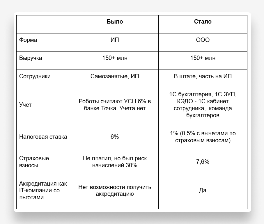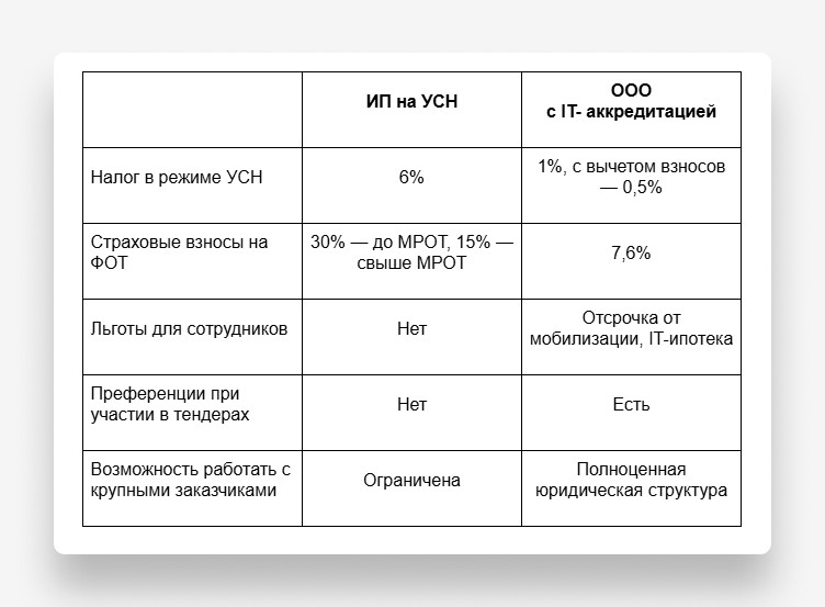 Собрали в таблице, что дал статус аккредитованной IT-компании. В пересчёте на сотрудников получилась экономия десятков тысяч рублей в месяц на каждого. Через три месяца после старта работы у клиента функционирует новая, чистая и устойчивая структура. Компания работает без рисков серых схем и авралов. А итоговая экономия по налогам и взносам составила больше четырех миллионов рублей в год. Теперь бизнес готов к росту: можно масштабироваться, искать инвесторов и привлекать новых заказчиков. Если у вас ИП с растущим оборотом, самозанятые в команде и автоматический учёт без контроля — это сигнал пересмотреть структуру. Рост приносит новые требования по налогам, отчётности, оформлению. Лучше подготовиться, чем решать вопросы с ФНС постфактум. Чтобы не попасть в такую ситуацию, вот что можно сделать заранее: Иногда смена формы, региона и пары строк в отчётах снижает налоги на миллионы рублей и даёт спокойную жизнь. Если хотите разобраться в бухгалтерии для IT, подпишитесь на наш телеграм-канал. Мы пишем о налогах, льготах и подводных камнях, которые лучше обойти заранее.