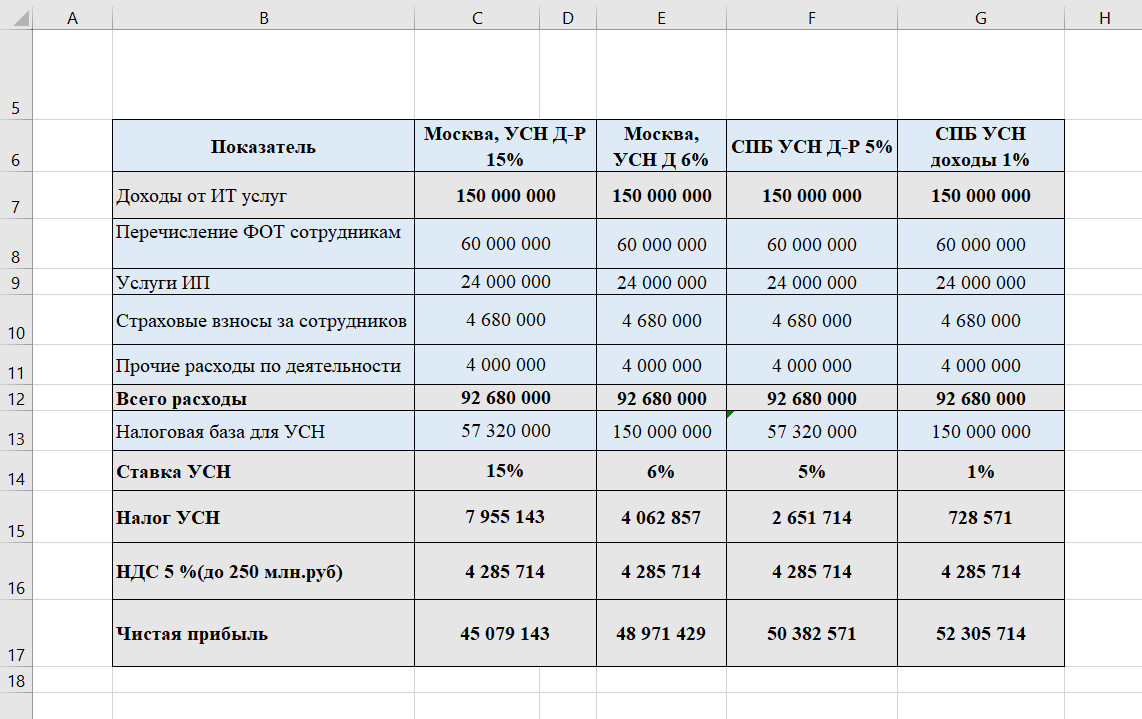 - в Петербурге ставка УСН для IT-компаний — 1%, а в Москве — 6%;