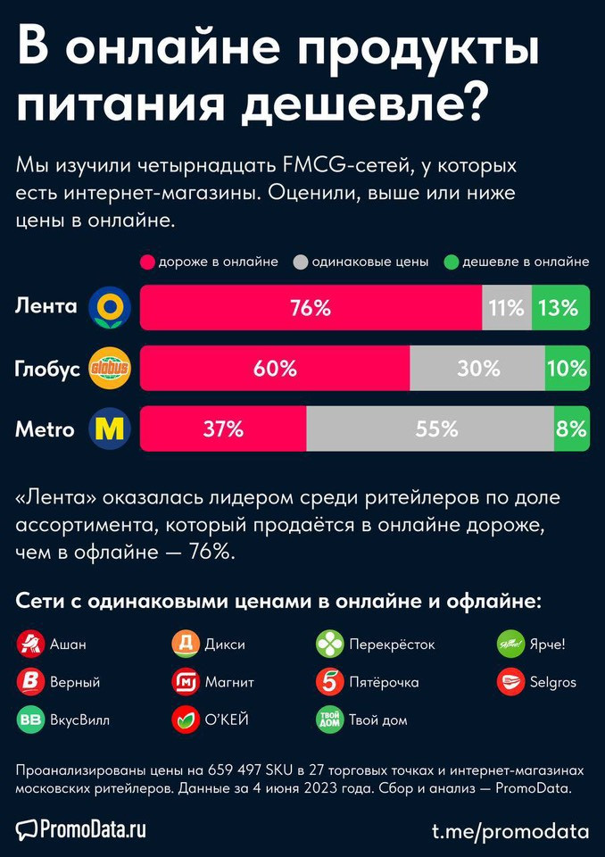 1. Изучили четырнадцать FMCG-сетей, у которых есть интернет-магазины. У каждого ритейлера сравнили онлайн-цены с офлайном. Только у трёх из четырнадцати игроков онлайн-цены отличаются от офлайна. И все трое в онлайне стоят дороже.