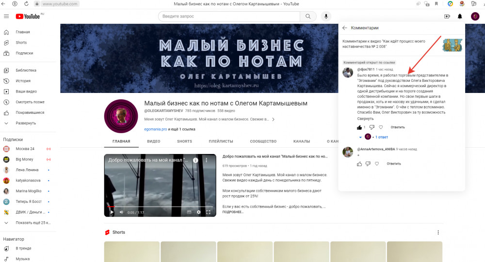 5. И люди из сегодняшнего дня благодарят меня за помощь, хотят стать участникам моего нового закрытого канала по подписке, который вот-вот стартует. А вот благодарность из прошлого прилетела на мой канал совершенно неожиданно, смотрите приложенное фото. Написал её человек, который начинал свой трудовой путь с должности торгового представителя в моей компании, а сейчас стал коммерческим директором. Цитата «Спасибо вам, Олег Викторович, за ту возможность». Такие слова дорогого стоят, поверьте!
