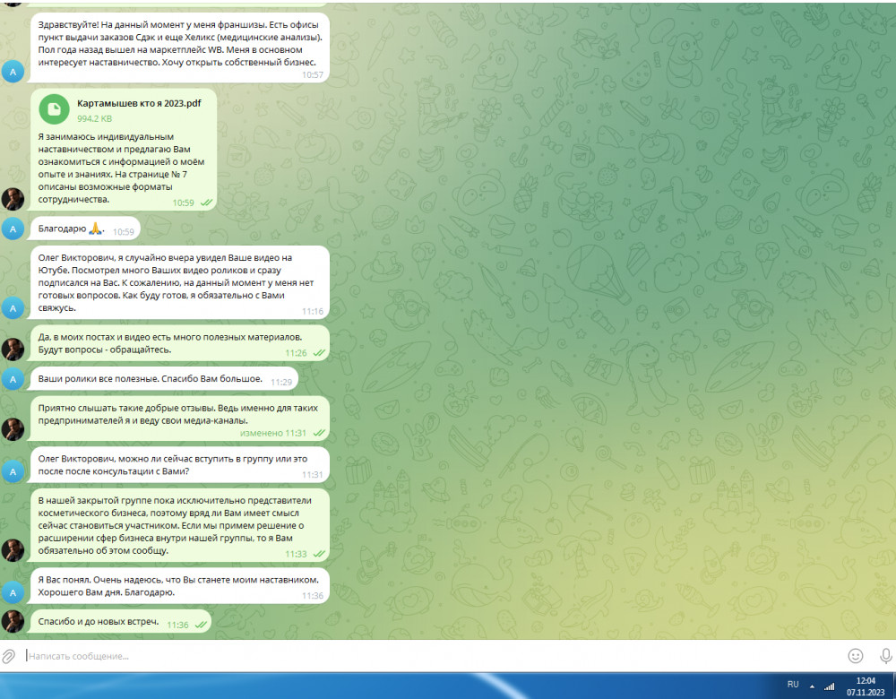 Отдельно хочу подчеркнуть, что с каждым обратившимся я общаюсь лично, без ботов и помощников.