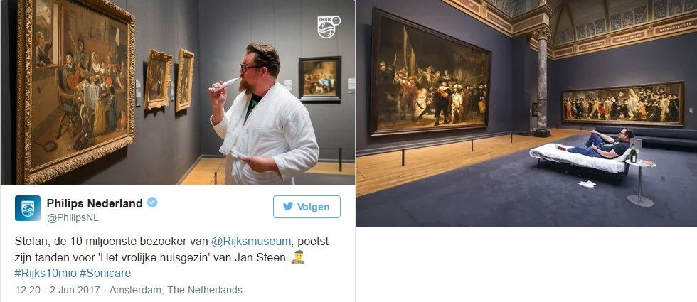 3. Привлекайте к своему маркетингу коллег! Посетитель, ночующий в музее, и чистящий зубы рядом с картиной щёткой Philips — это же реально круто.
