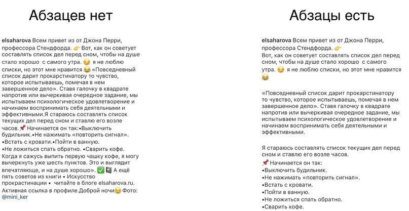 - Пустые строки между абзацами делаются с помощью «неразрывного пробела». Смотрите тут: https://www.elsaharova.ru/blog/instagram