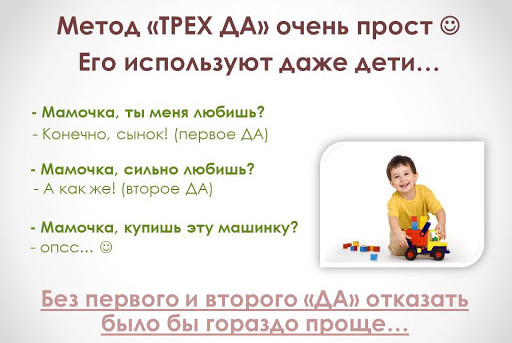 Механизм «Трёх ДА» гениален и захватывает сразу два блока устройства нашего мозга и психики.