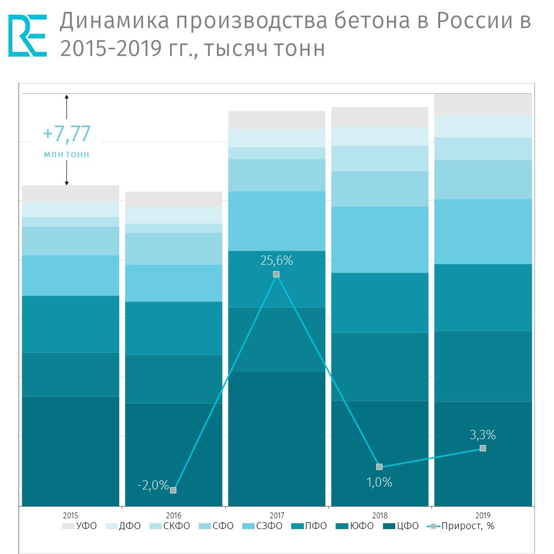 Наибольший объем производства бетона в прошлом году был отмечен в Центральном федеральном округе и составил 25,4% от общероссийского выпуска. Однако, строительный сектор в центре страны прошел пик ещё в 2017-м. За два года ежегодный выпуск бетона там сократился на 2,6 миллиона кубометров.