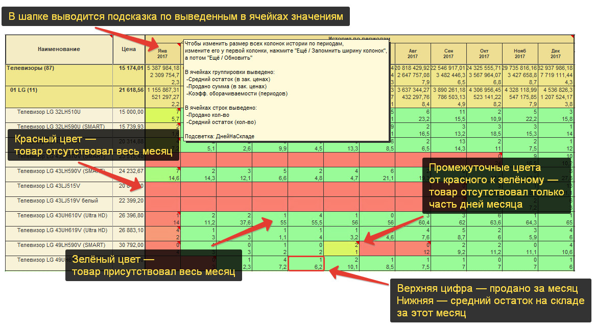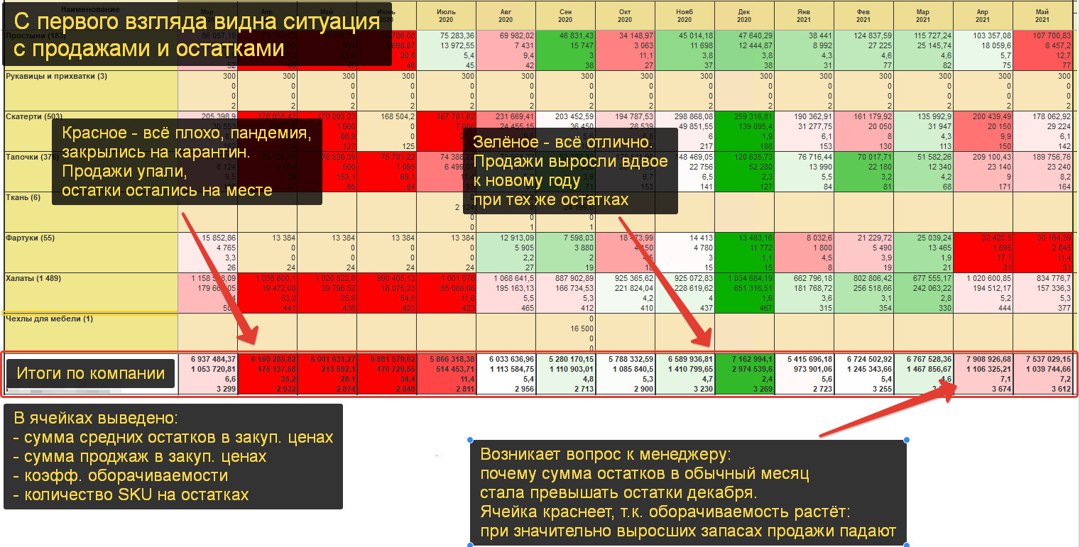 Так родились «Примеры настроек», где собраны уже готовые настройки на самые распространенные случаи использования нашей системы. Еще одна крутая доработка, на которую меня натолкнули эти семинары: инструмент для помесячной аналитики запасов с точки зрения прибыли, оборота и вложенных в склад средств. Например, на рисунке ниже по группам выведена информация по оборачиваемости: Периоды с высокой (плохой) оборачиваемостью подсвечены красным, с хорошей — зелёным. В этих же ячейках можно выводить и другие данные и с любой периодичностью. Вот, например, в таком виде отчет может использоваться закупщиком при расчёте текущего заказа поставщику: В истории по периодам могут быть выведены показатели: При этом, в ячейках групп могут быть выведены одни показатели, а в товарах другие. Например, нет смысла выводить итоговое количество проданного товара по всей компании (нет смысла складывать 2 шуруповёрта и 100 саморёзов. Итоговые 102 ничего нам не скажет), поэтому по группам правильней выводить выручку в рублях, а количество — только по товарам. Подсветить ячейки можно: Аналогично, можно сделать различную подсветку для группы и для товаров. Например, подсвечивать группы по оборачиваемости (видны тенденции в общем), а товары по наличию (видно наличие / отсутствие каждой позиции). Список всех последних изменений смотрите у нас на сайте в разделе «Обновления».